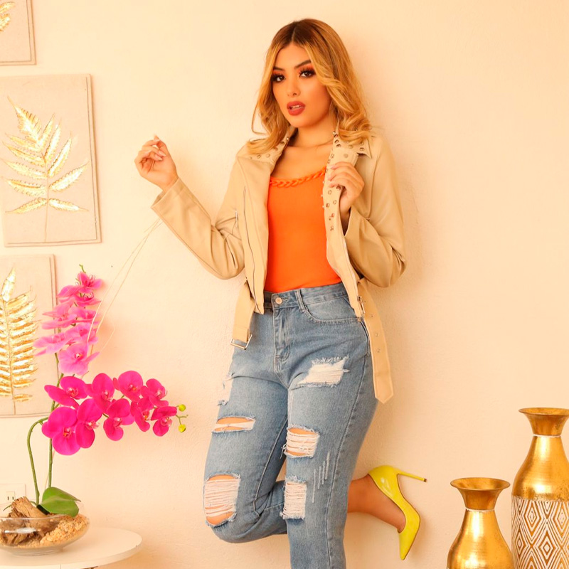 Chamarra de vinipiel con estoperoles. Excelente calidad en vinil con cinturón. Cierres metálicos. Con excelente corte que estiliza tu silueta.