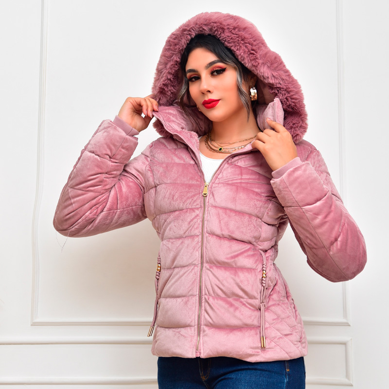 Chamarra corte básico, capitoneada. Capucha desmontable con mink. Forro de peluche. Detalle de cordones en bolsillos.