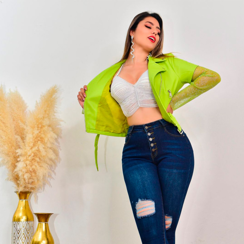Increíble chamarra con mangas de red incrustadas de brillos. Con cinta con hebilla.