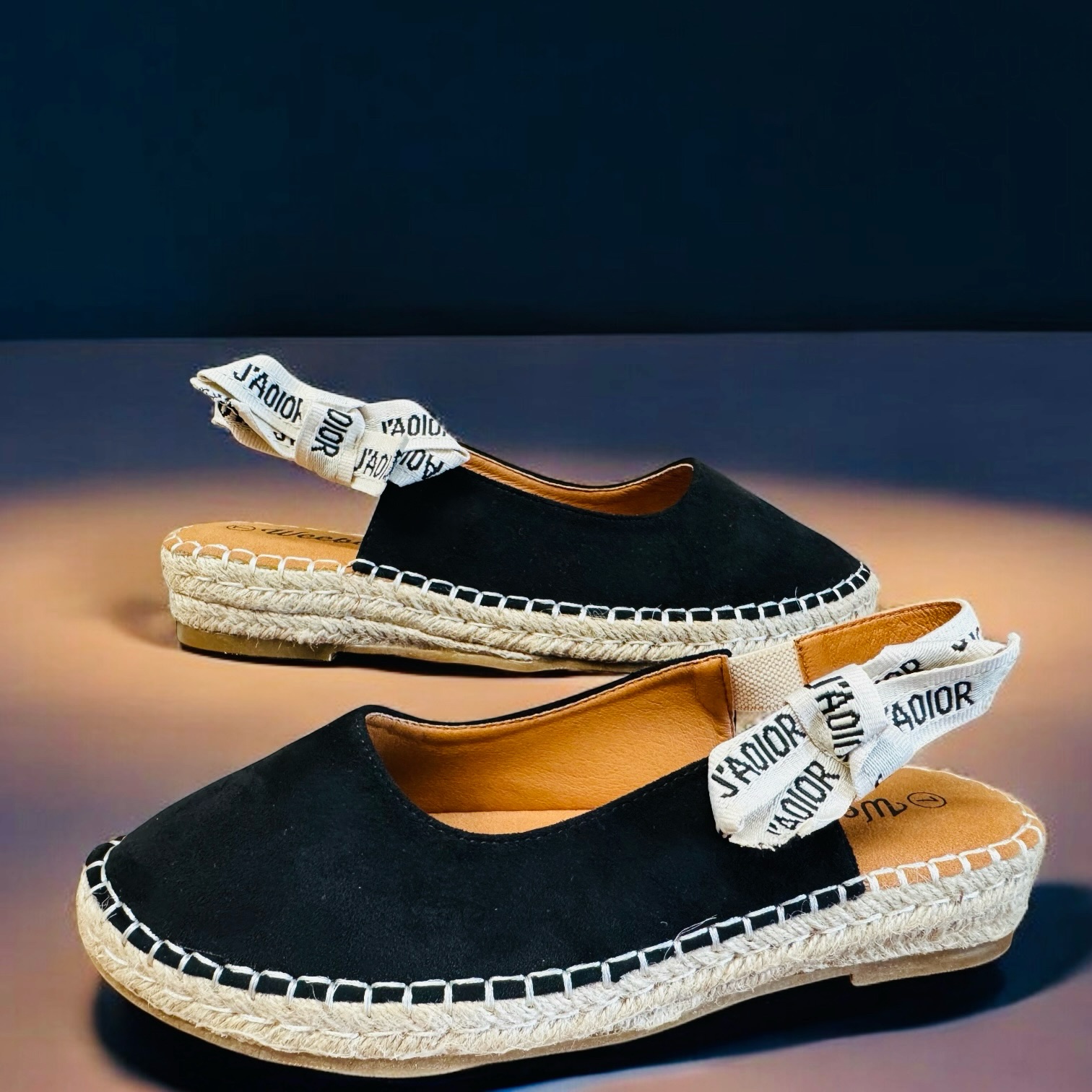 Alpargatas femeninas estilo slingback, elaboradas en textil tipo gamuza suave. Diseño cerrado al frente con punta redonda, detalle de moño en listón estampado con letras que aporta un toque trendy y elegante. Suela tipo yute trenzado con costura visible y base de goma antiderrapante para mayor seguridad y comodidad al caminar. Perfectas para outfits casuales y primaverales, cómodas y ligeras para uso diario.