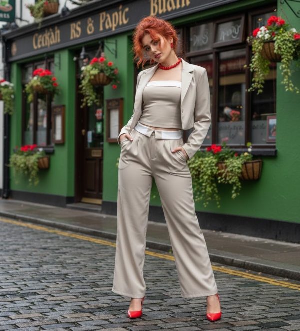 Conjunto de tres piezas sofisticado. Top strapless ajustado, con detalle en contraste blanco. El pantalón de tiro alto, con pierna ancha y pretina contrastante, aporta un toque moderno y fluido. Top corto de un botón con forro satinado. Perfecto para un look elegante y minimalista que combina estilo y comodidad.