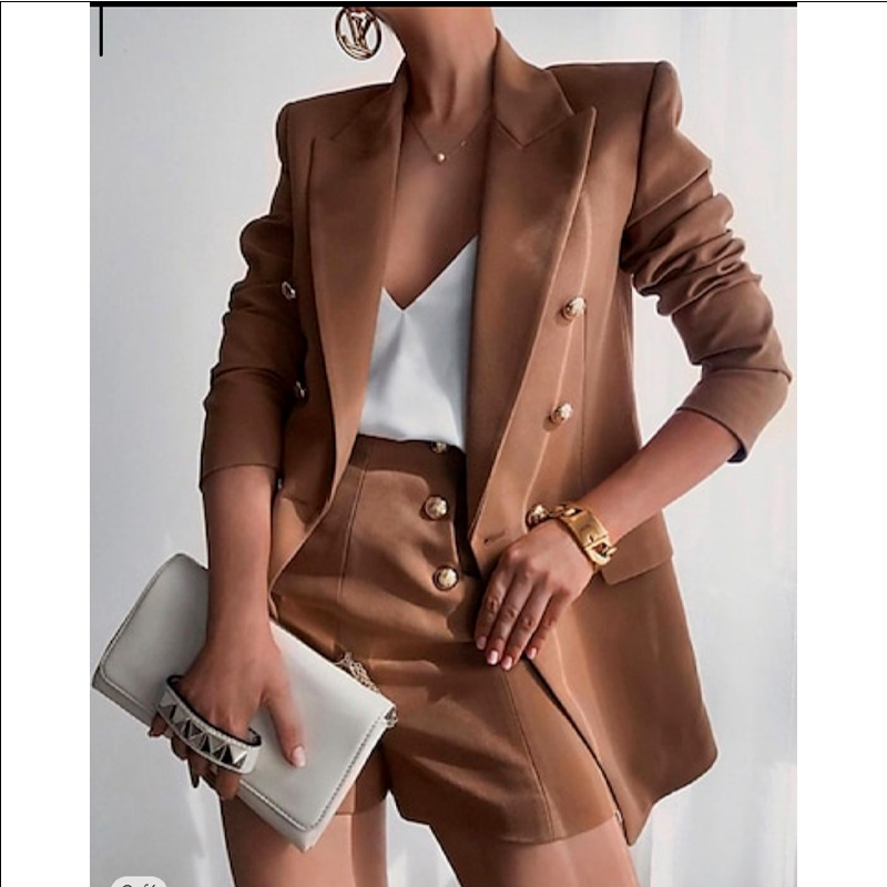 Conjunto de dos piezas, blazer con forro y doble botonadura y shorts a juego, ambos con bolsillos funcionales. El diseño es elegante y moderno, ideal para ocasiones semiformales, con detalles en botones dorados que aportan un toque sofisticado. Tela rígida.