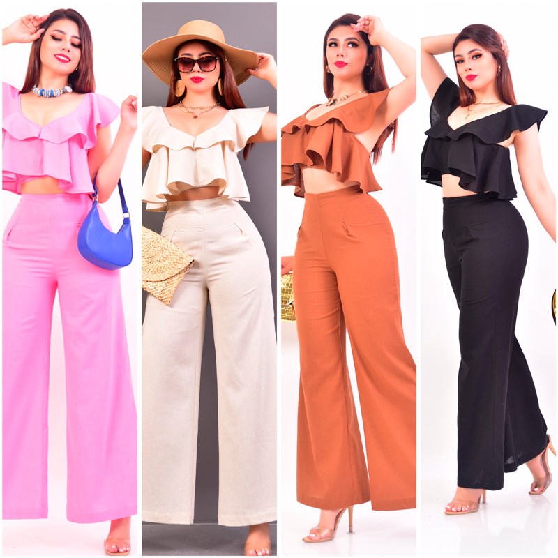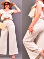 Conjunto dos piezas. Confeccionado en viscosa y lino. Top de tirantes diseño de escarolas, cremallera metálica en espalda. Pantalón palazzo sin botón, con cierre invisible trasero. Tela rígida.