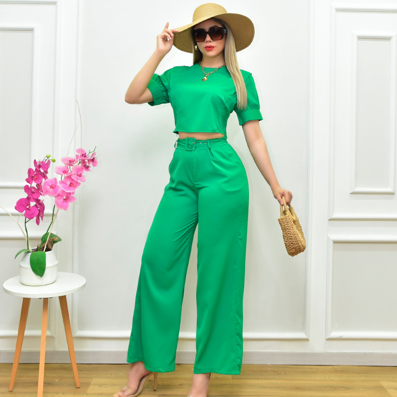 Top manga corta y cuello circular. Pantalón recto con cierre unicolor y botón frontal. Incluye cinturón. Tela strech.