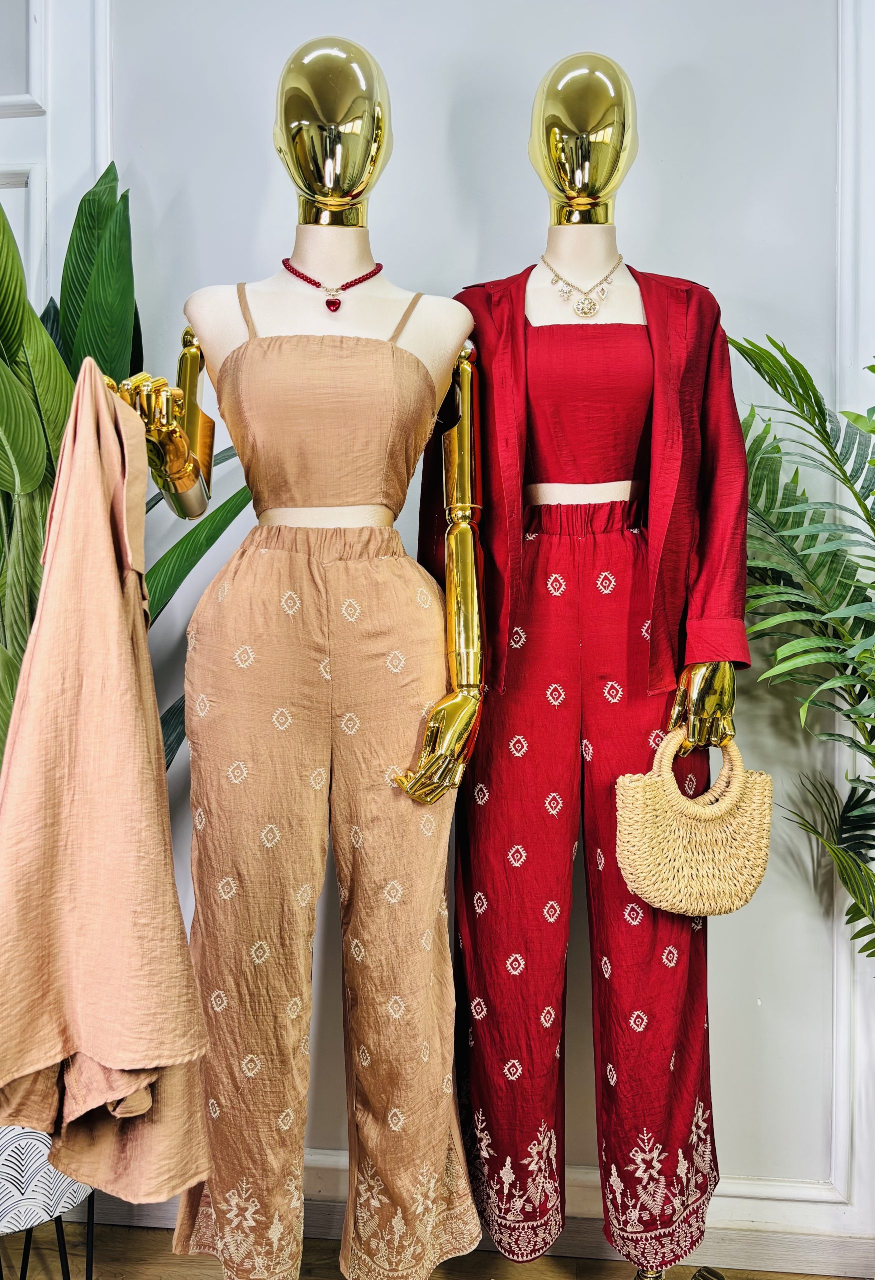 Conjunto de tres piezas que combina estilo, comodidad y elegancia bohemia. Incluye un top tipo crop de tirantes, un pantalón palazzo con bordado étnico en la parte baja con elástico en la cintura y bolsillos a los costados, y un kimono o camisa de manga larga holgada, ideal para usar abierta o cerrada. Con un diseño ligero, fresco y fluido, es perfecto para la temporada primavera-verano o para ocasiones casuales con un toque chic.