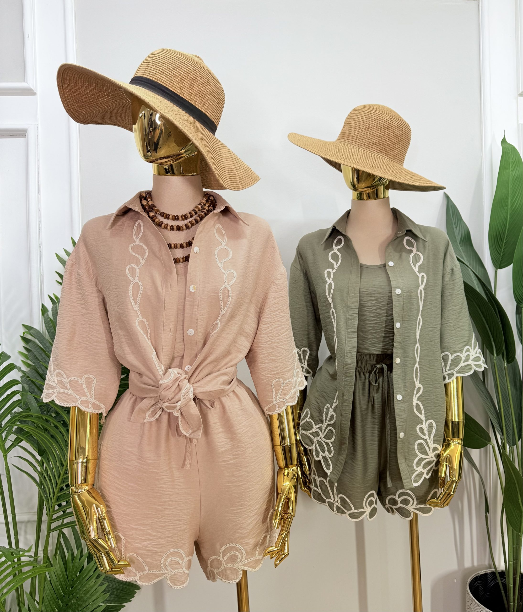 Hermoso conjunto de 3 piezas, camisa, top y short.