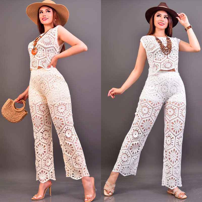 Conjunto de dos piezas tejido punto crochet. Blusa sin mangas. Pantalón corte recto con forro de short. Acabados de picos en cintura y bastillas. 📌 Corte fiel a la talla IMPORTACION CALIDAD 💎💎💎💎💎💎💎💎