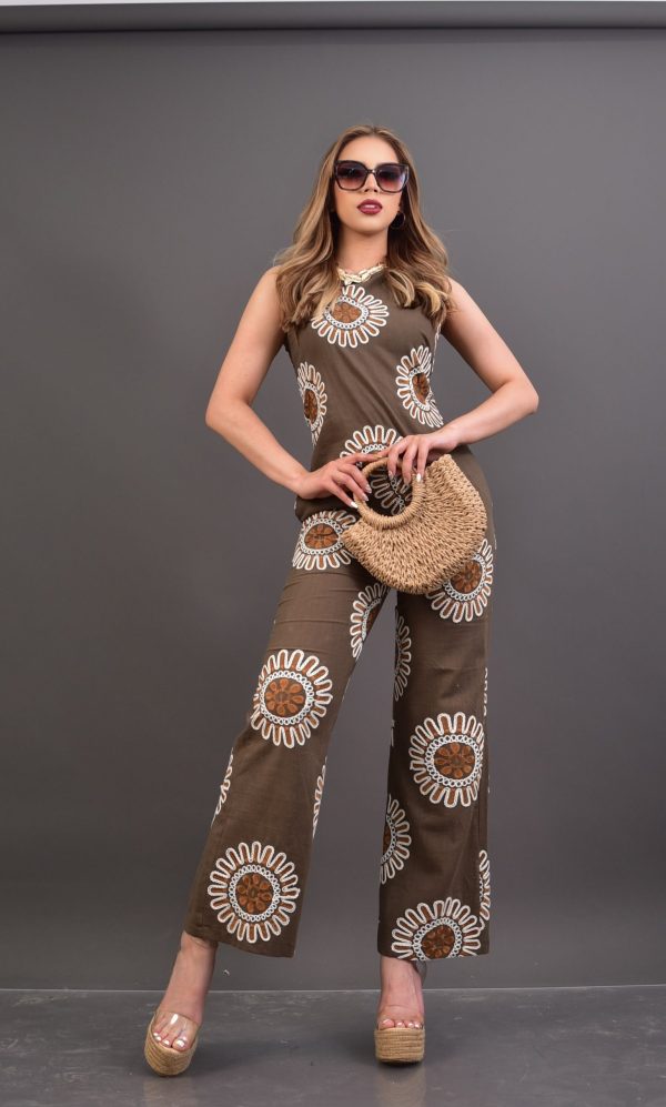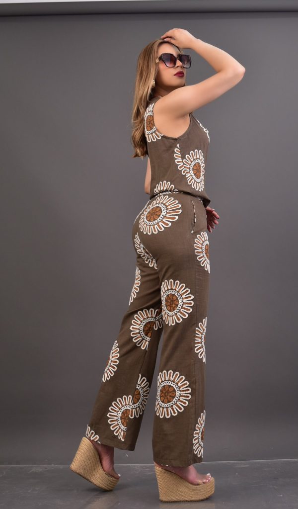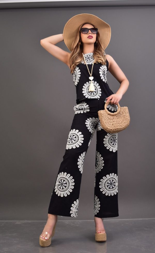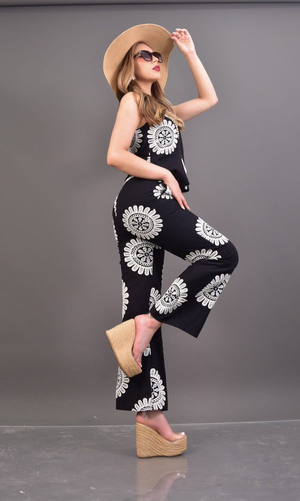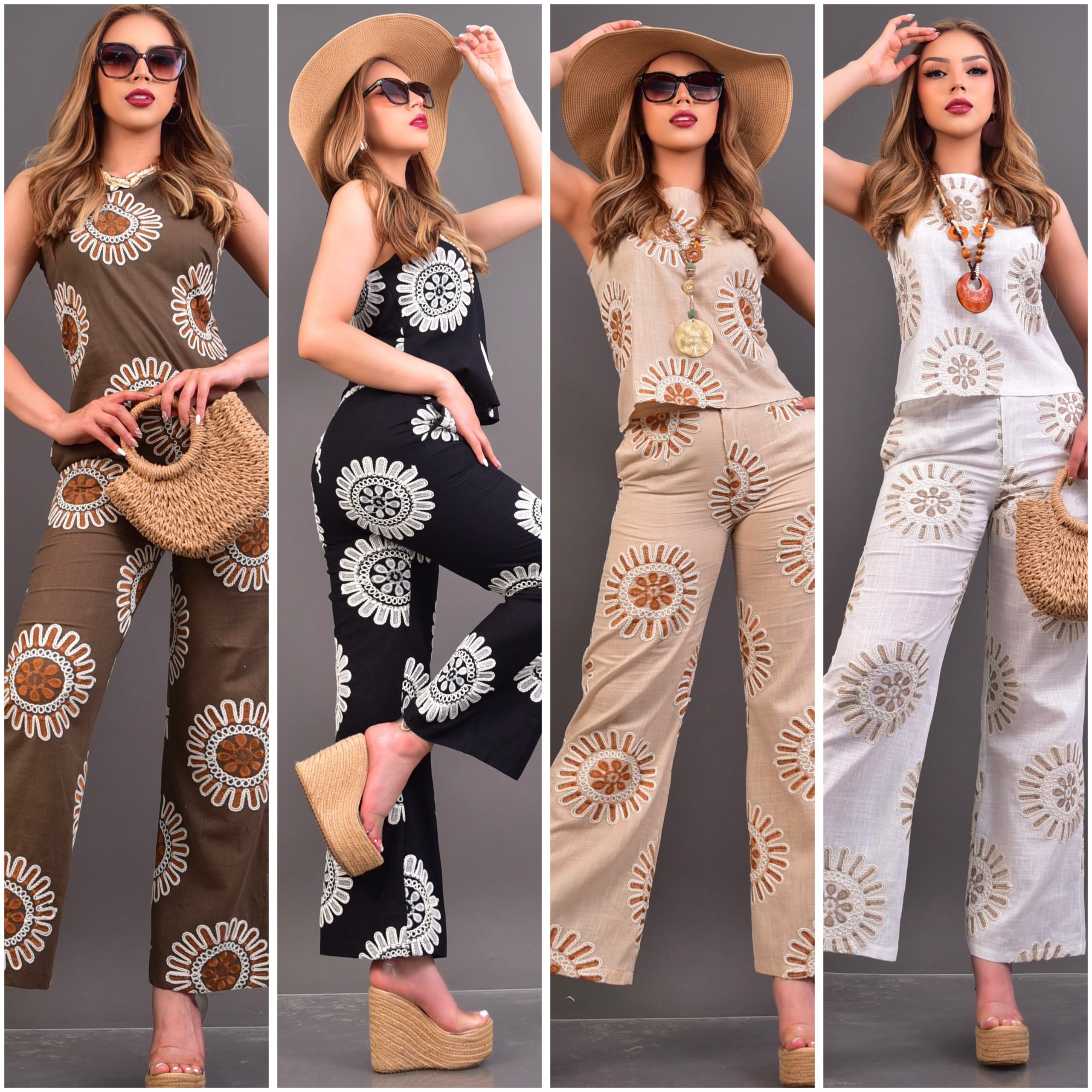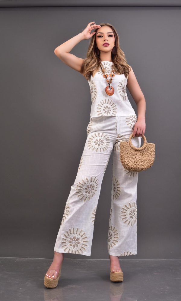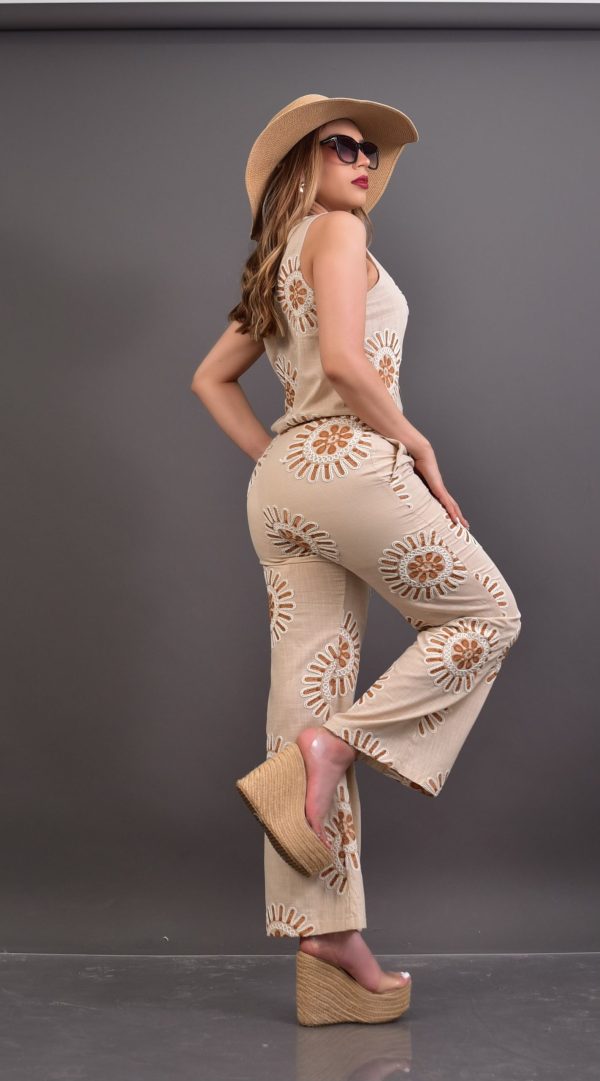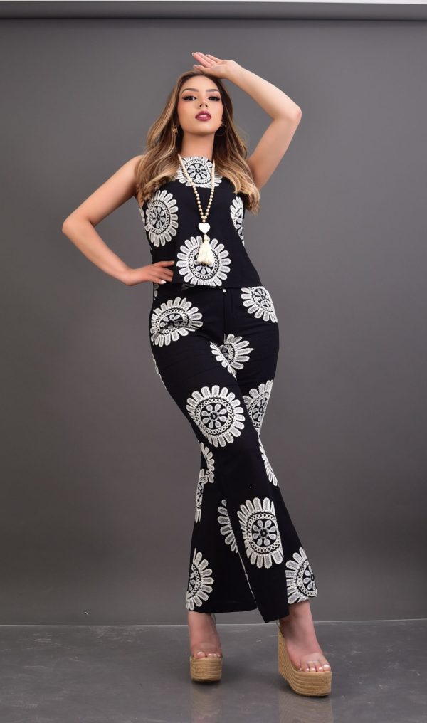 Conjunto de pantalones y blusa con flores bordadas y detalles de crochet. Blusa de corte cuadrado (no estira). Pantalón con forro y elástico en la parte trasera, bolsas a los costados y corte recto.