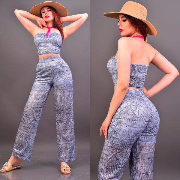 Conjunto de dos piezas super fresco. Top calado con elástico fruncido en espalda, forro frontal en busto. Pantalón corte recto, calado, cierre invisible, forro de short en mismo tono para mayor comodidad.