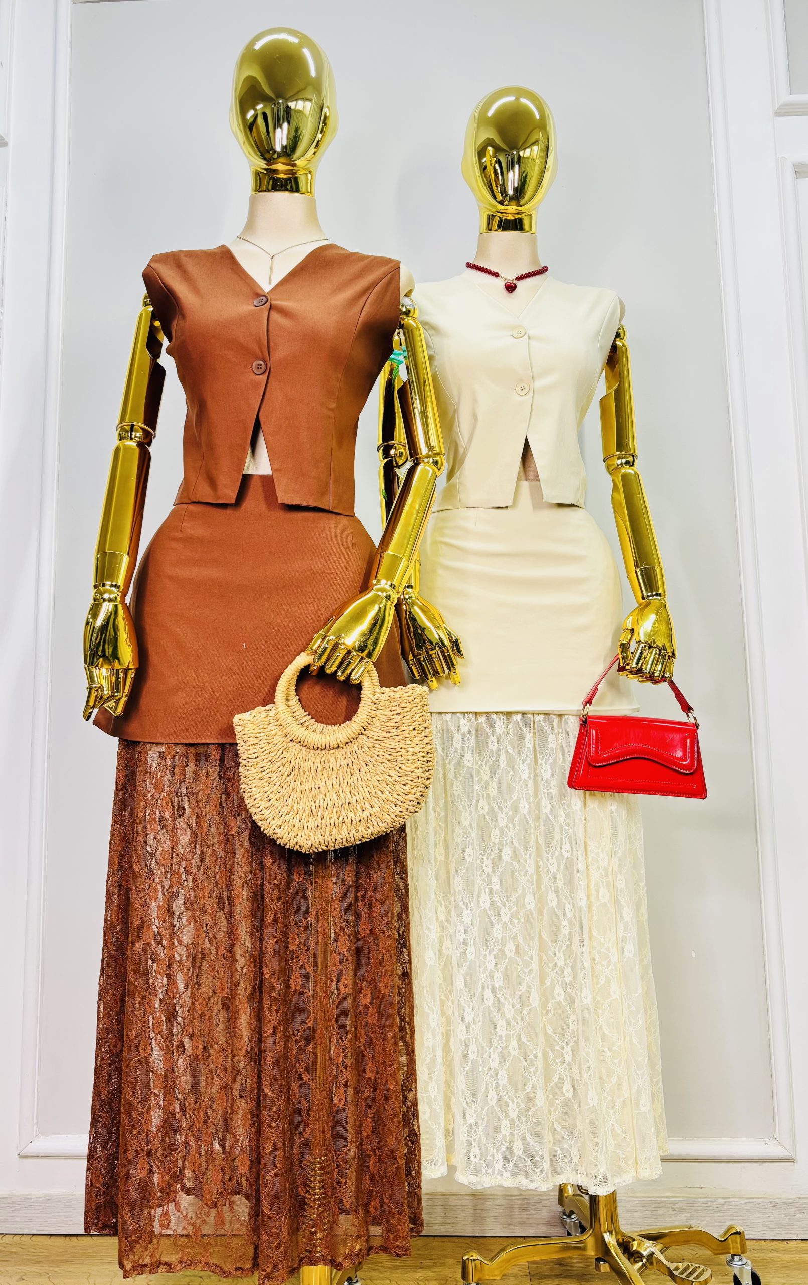 Conjunto de 2 piezas. Chaleco con botones frontales corte recto. Falda con base corta lisa e interior largo de encaje, elegante y con movimiento. Cierre invisible lateral. Tela semi stretch. Perfecto para outfits casuales chic o eventos especiales, fácil de combinar con accesorios ✨.