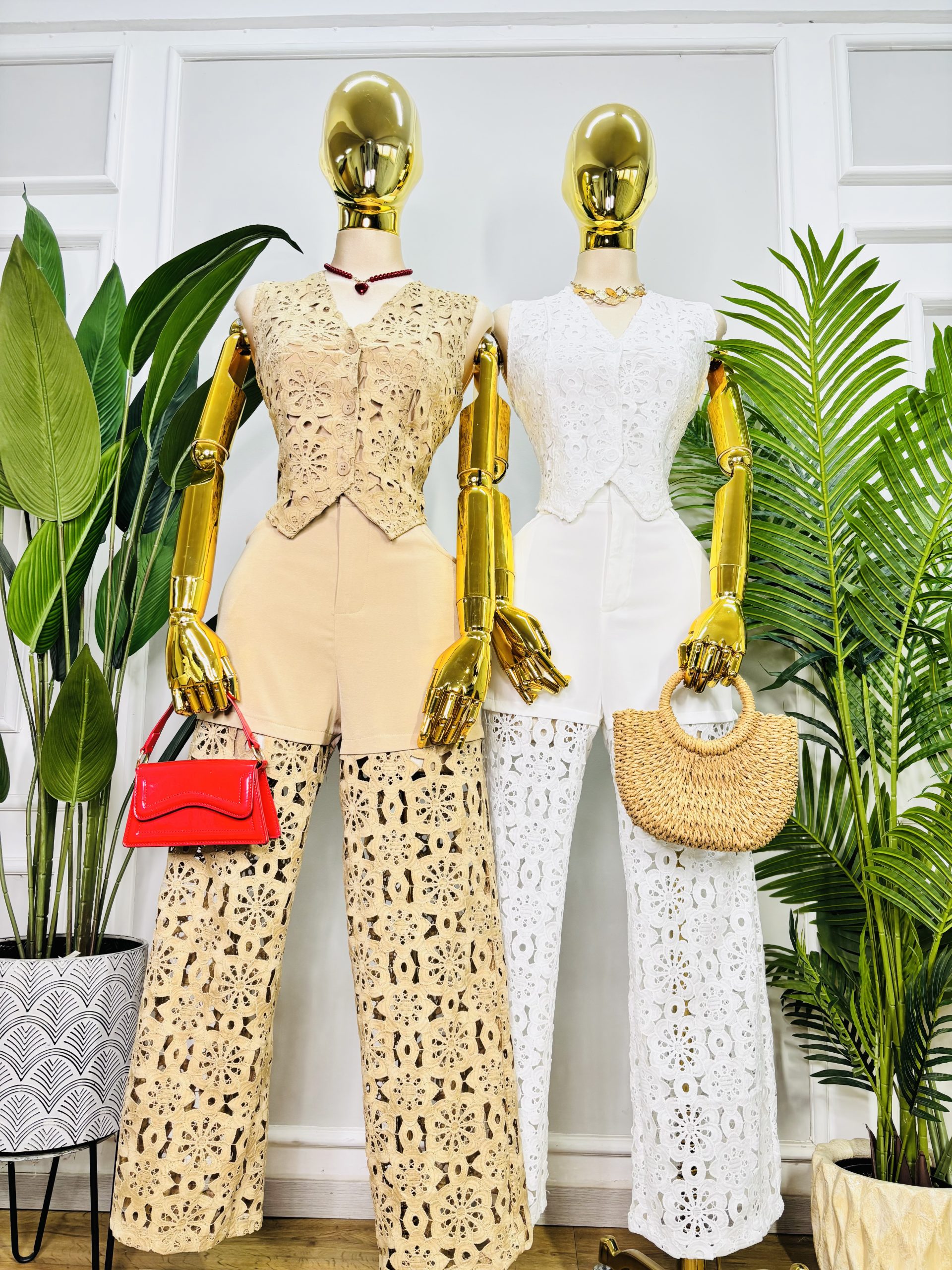 Conjunto de 2 piezas. Chaleco sin mangas con botones frontales confeccionado en encaje bordado, y un pantalón de tiro alto con corte amplio, adornado con transparencias geométricas que aportan un aire chic y moderno. Perfecto para lucir en eventos, salidas de día o de noche, este conjunto resalta tu figura y brinda comodidad sin perder elegancia.