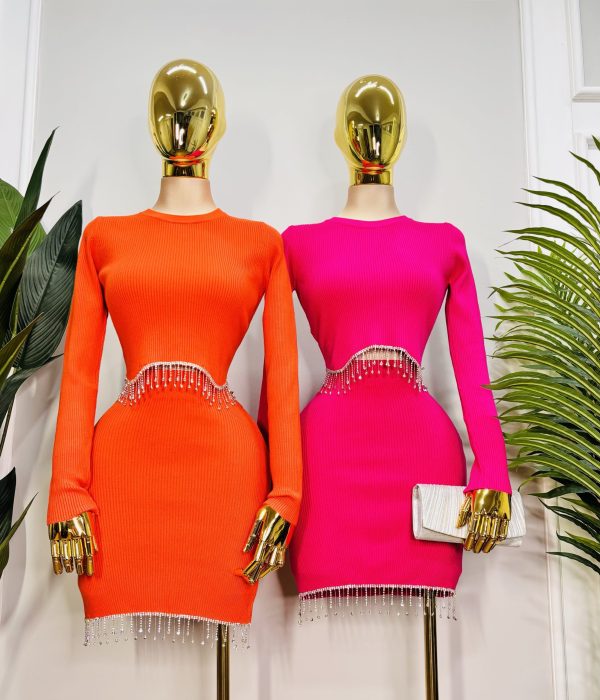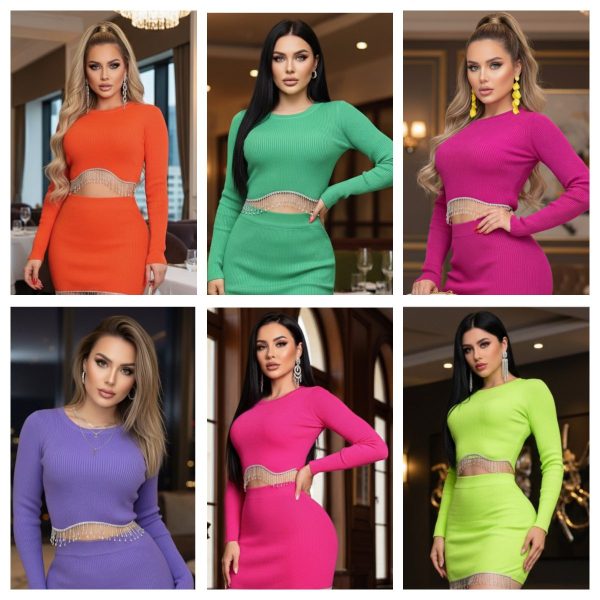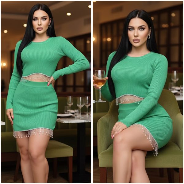 Blusa de manga larga. Falda corta con pretina elástica. Colgantes en ambas prendas, lo que aporta un toque especial y Glam a tu look. ✨