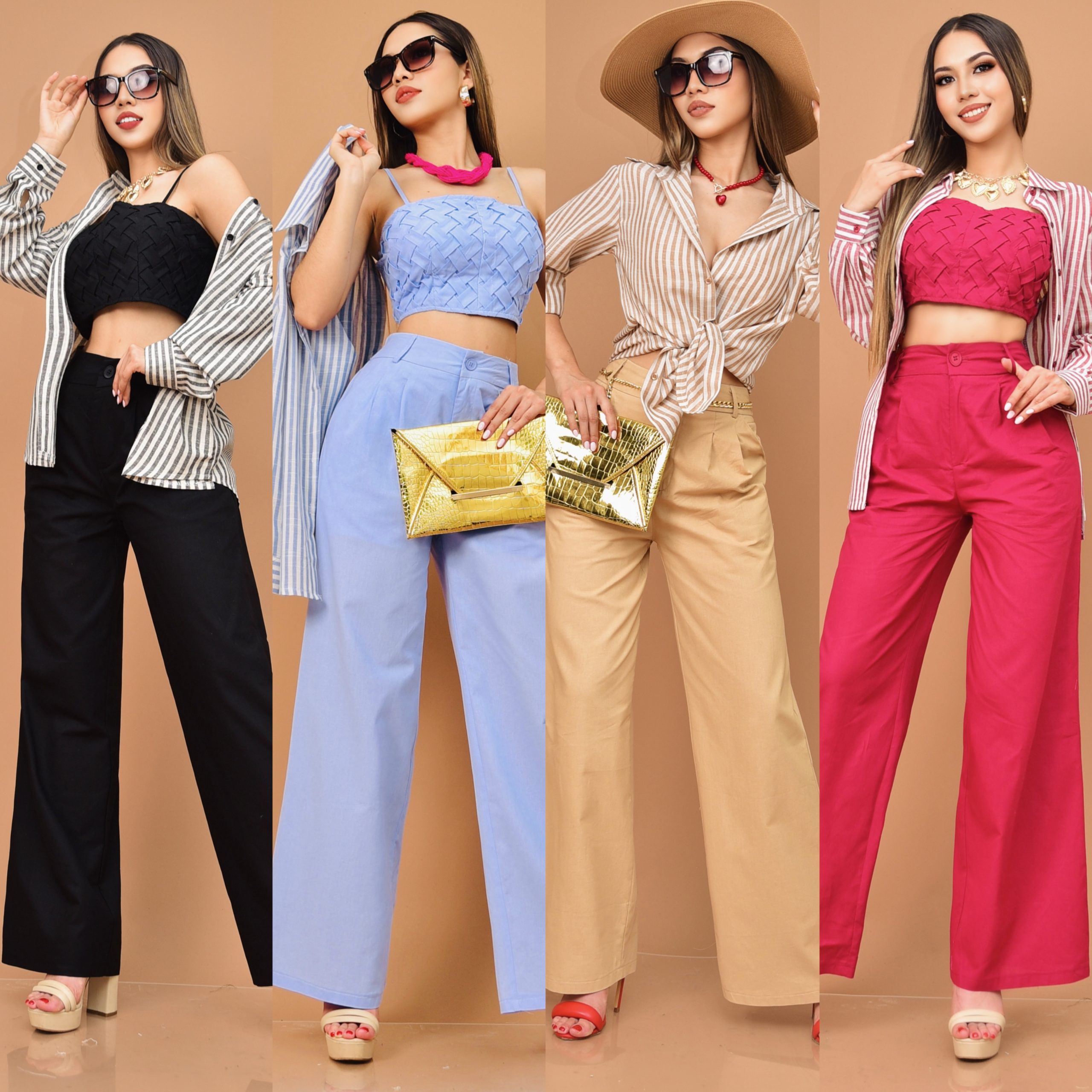 Pantalón de tiro alto y corte amplio (tipo palazzo), elástico en la parte trasera y bolsillos laterales.