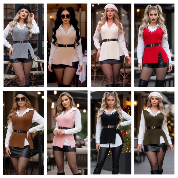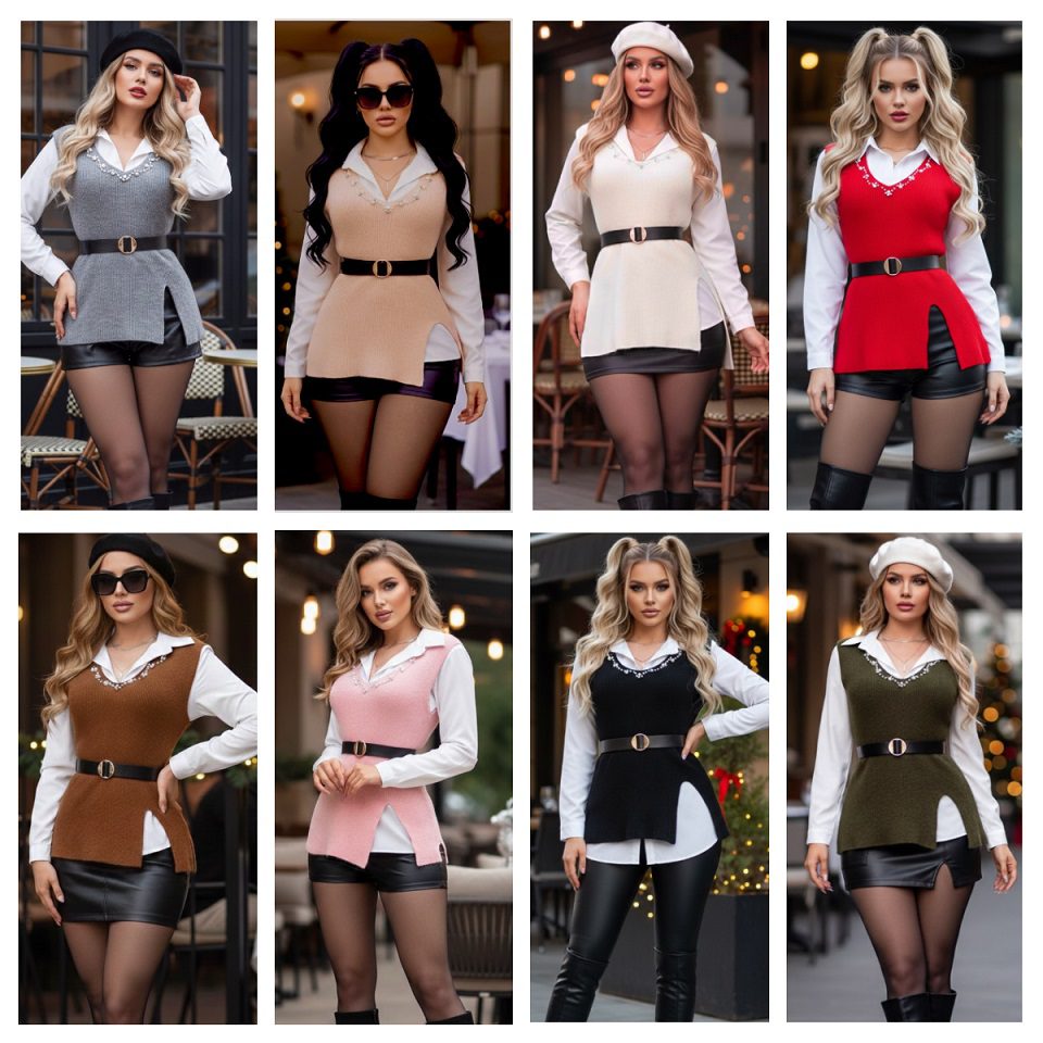 Conjunto de dos piezas, súper versátil. Chaleco de cuello en V con perlitas y delicados diamantes incrustados y delicada abertura a un costado. Camisa corte básico con elástico fruncido en mangas. Incluye cinturón con hebilla dorada.