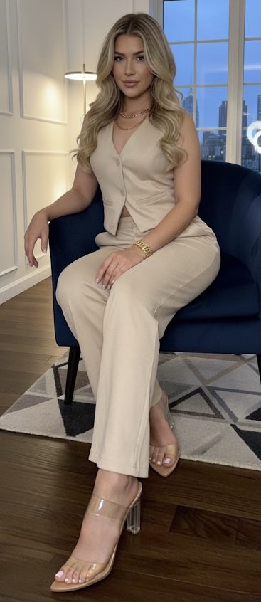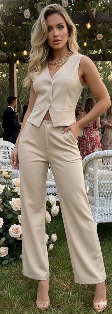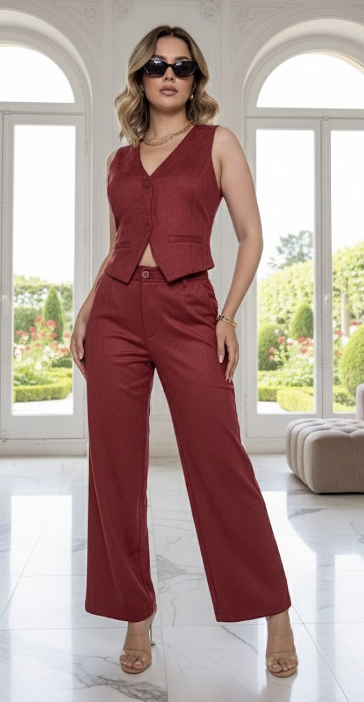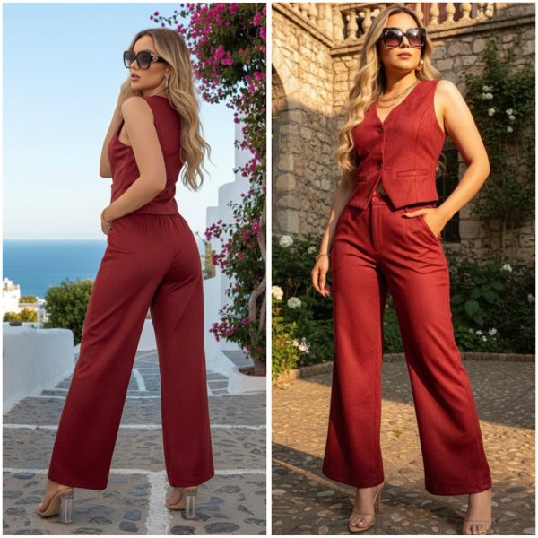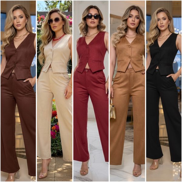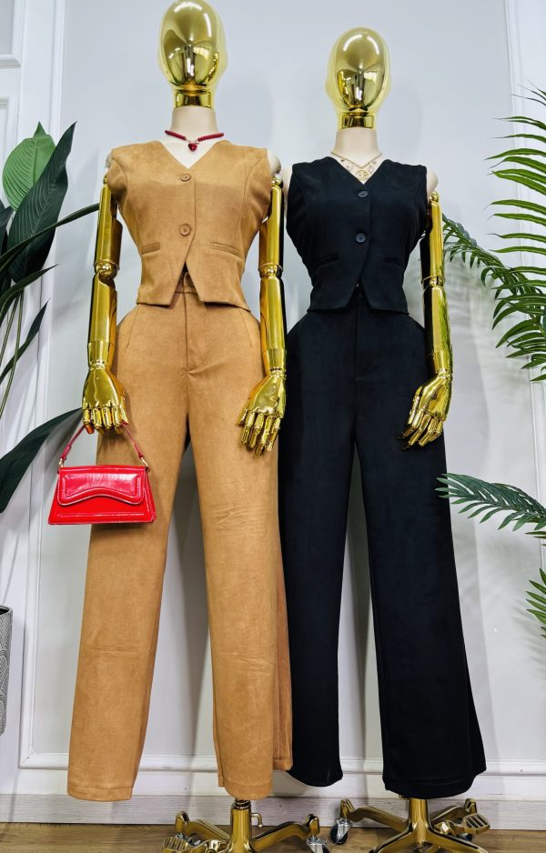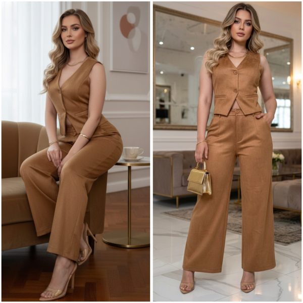 Conjunto de chaleco y pantalón confeccionado en gamuza y stretch. ✨ Chaleco con botones del mismo tono y cuello en V que realza la silueta. Pantalón amplio con bolsillos funcionales y pretina trasera elástica para un ajuste cómodo y favorecedor.