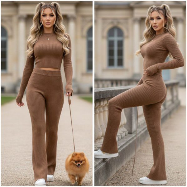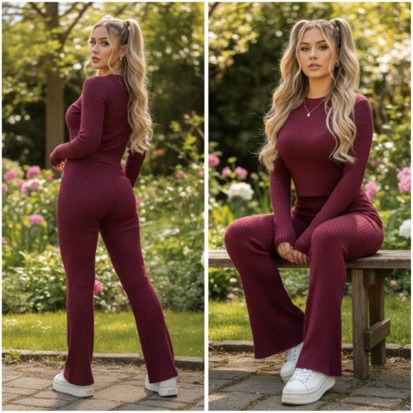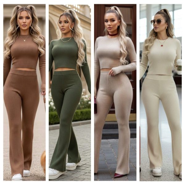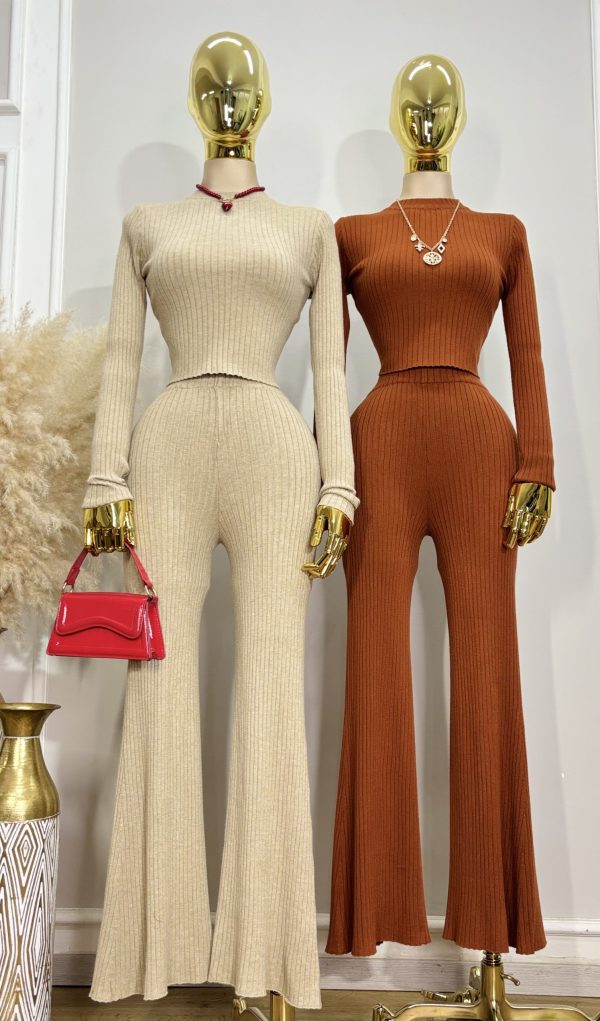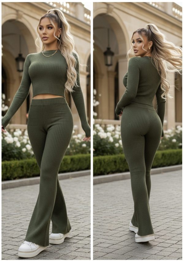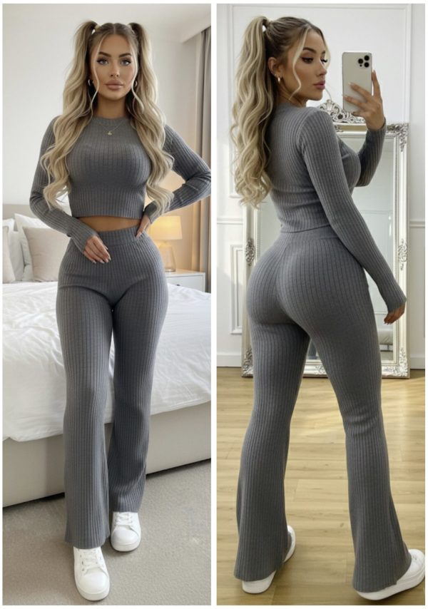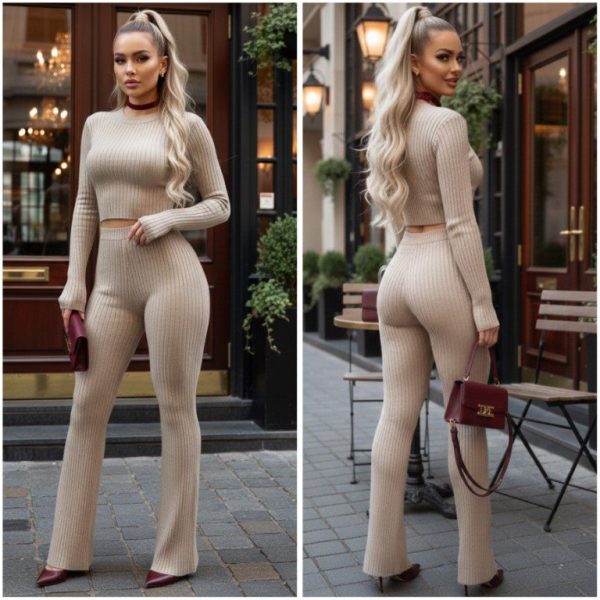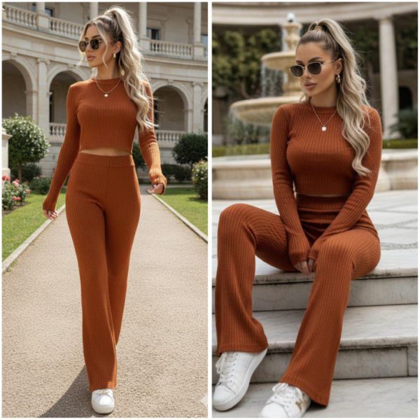 Conjunto de punto acanalado con blusa de manga larga tipo crop con cuello redondo y pantalón de tiro alto con corte recto que estiliza la figura y brinda un ajuste favorecedor.