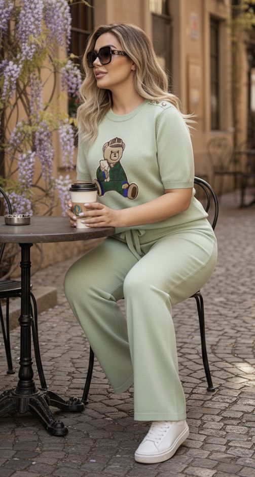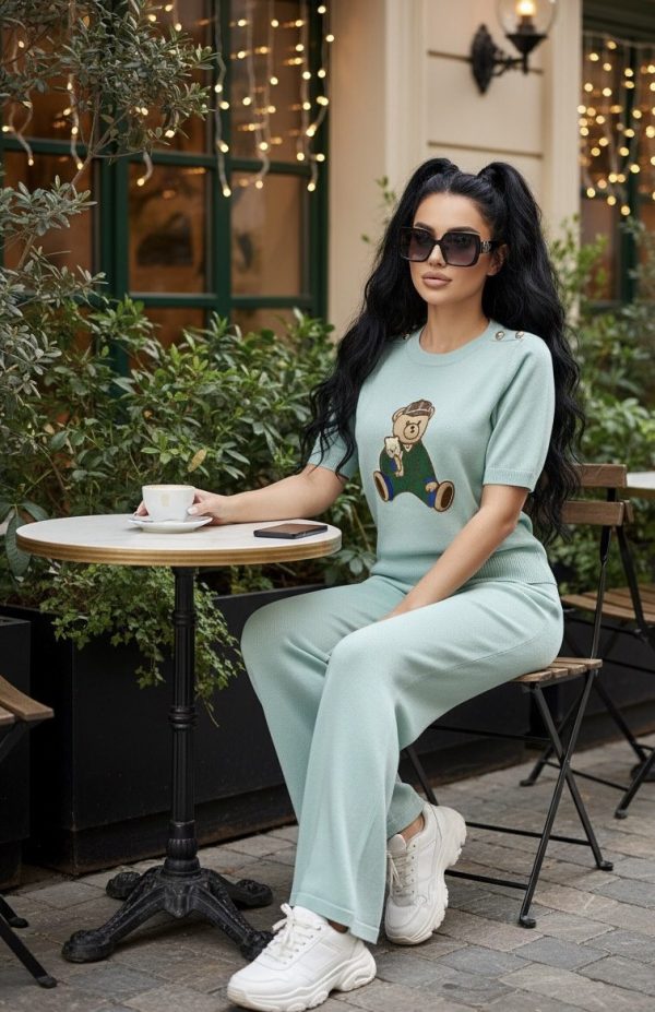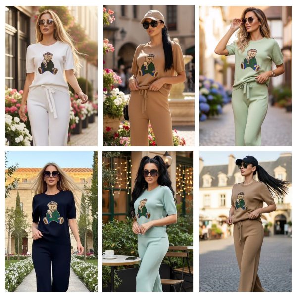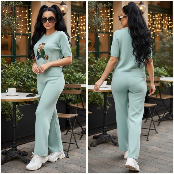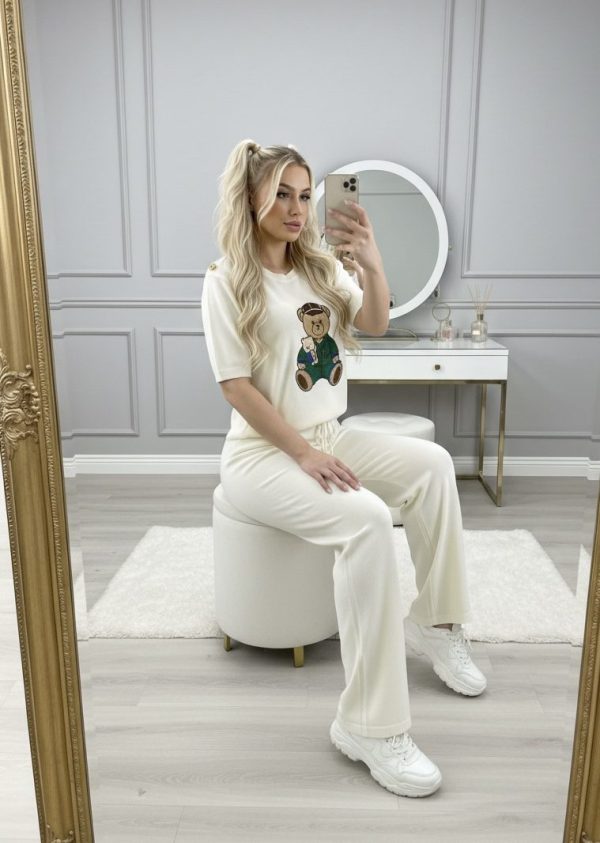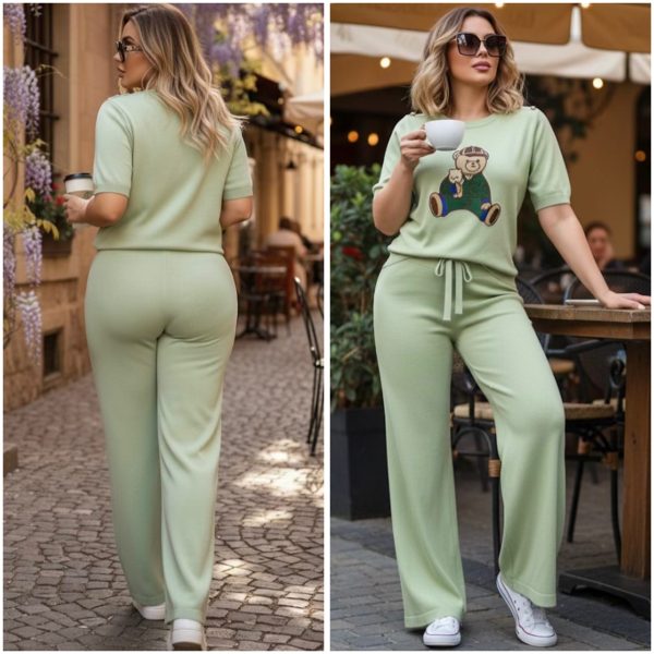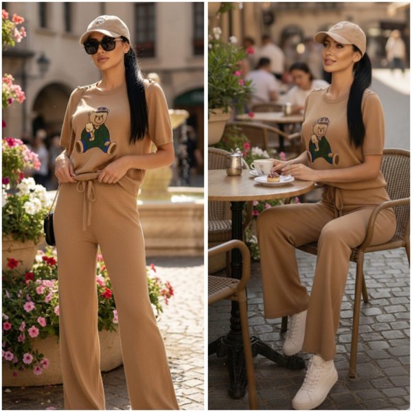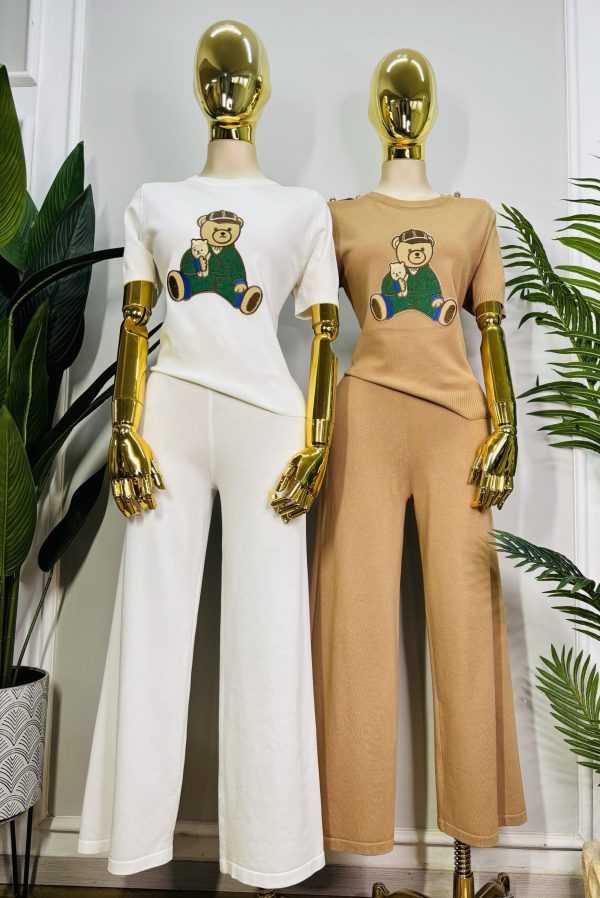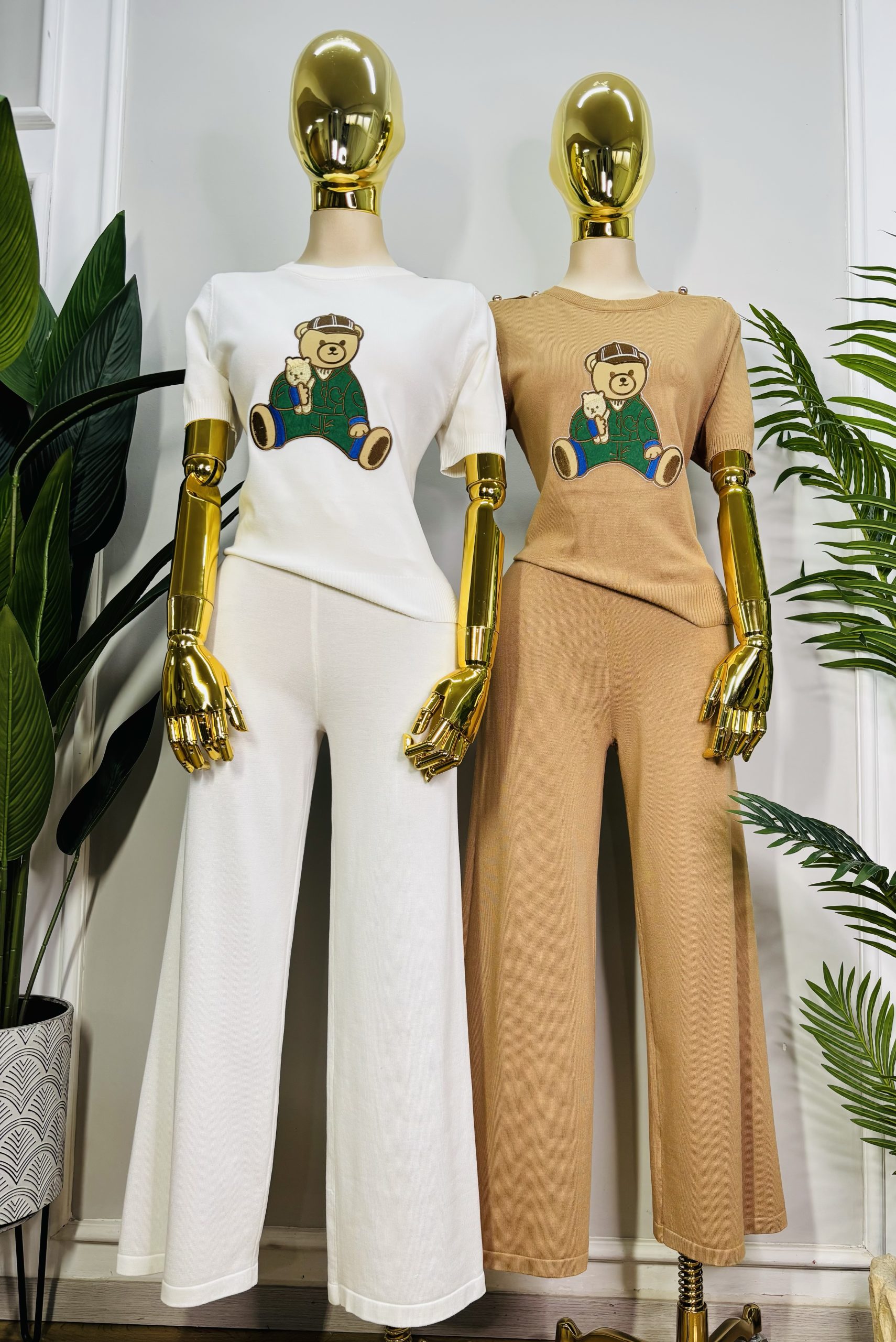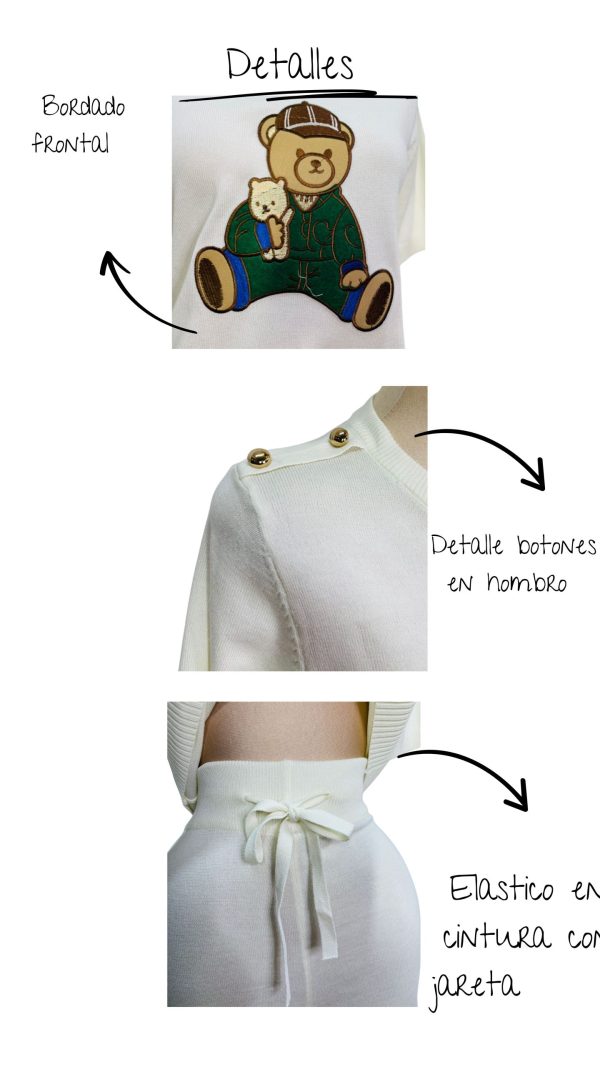 Conjunto comfy de dos piezas. Pantalón de corte amplio con pretina elástica y jareta ajustable. Blusa de manga corta, cuello redondo, botones dorados metálicos en hombros y detalle de osito en el frente, aportando un toque juvenil y tierno al look.