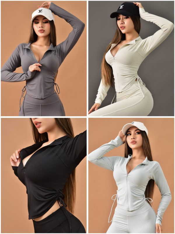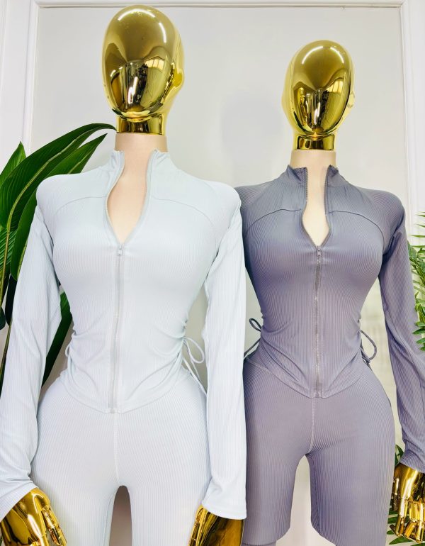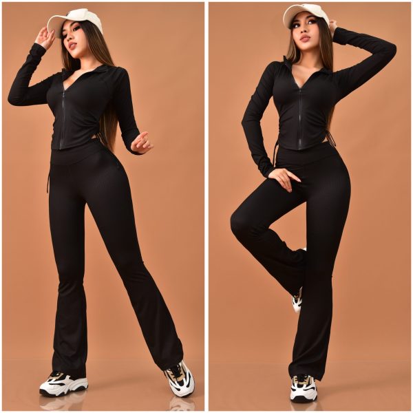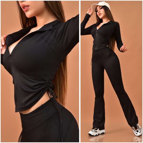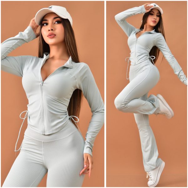 Conjunto de dos piezas. Leggings corte flare, cintura alta, diseño PUSH UP 🍑. Sudadera manga larga con cierre frontal y cuello alto, diseño ajustado incluye cordones laterales que permiten ceñir la cintura y darle un toque moderno y favorecedor. Confeccionado en licra acanalada de textura suave y súper stretch. 👟
