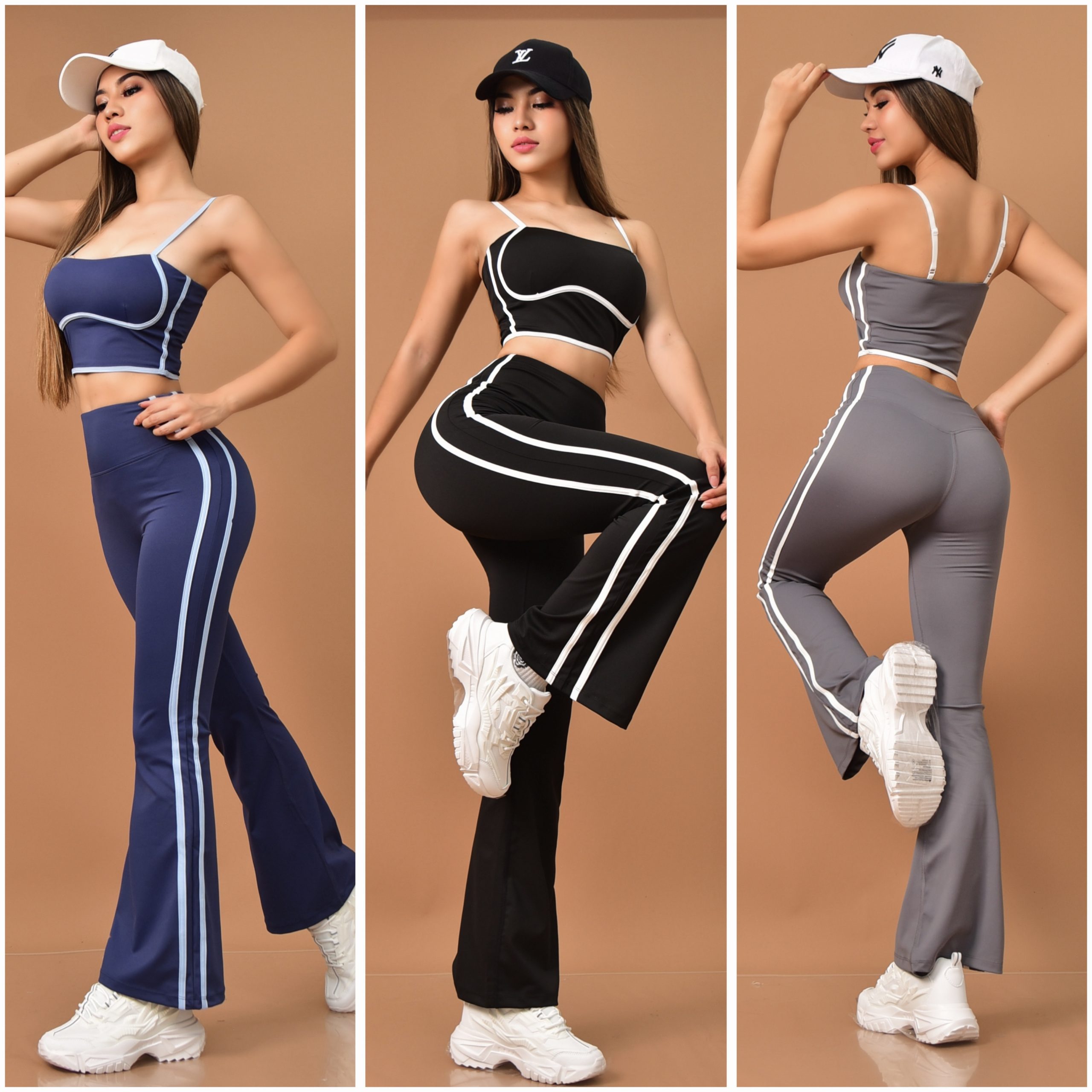 😍 Conjunto deportivo de 2 piezas, confeccionado en tela tipo licra de excelente calidad con stretch. Top con tirantes delgados ajustables. Diseño moderno corte tipo bustier que realza la figura y brinda soporte. Incluye copas. Leggings de cintura alta con franja lateral en contraste, que estiliza la silueta y aporta un toque dinámico. Corte acampanado tipo flare.