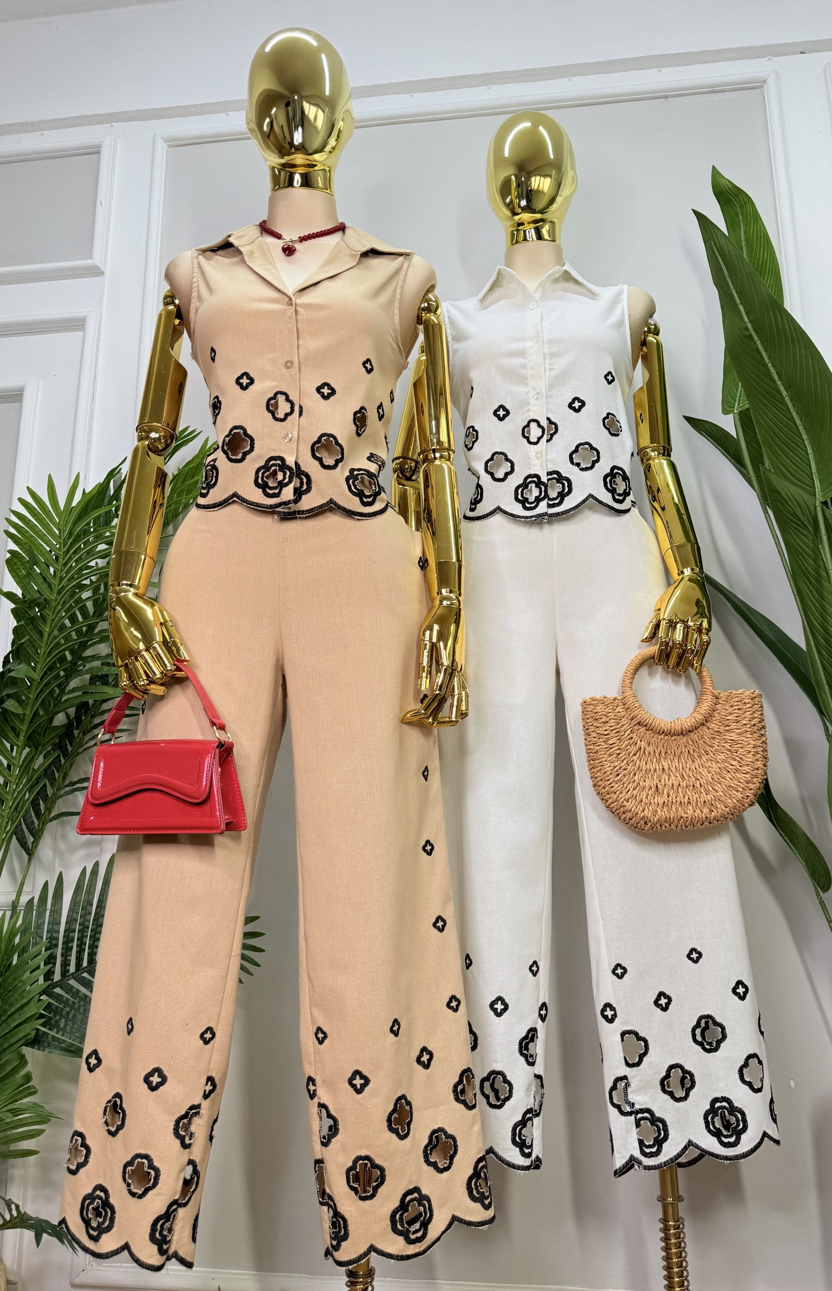 Conjunto femenino de dos piezas, compuesto por blusa sin mangas tipo camisera y pantalón recto, ambos con detalles bordados florales que decoran los borden inferiores. La blusa tiene cuello clásico y corte recto y botones frontales, ideal para un look pulido y fresco. El pantalón de pierna recta mantiene la armonía del diseño con el mismo bordado en la parte baja y cuenta con bolsillos laterales. Tela de viscosa.
