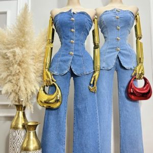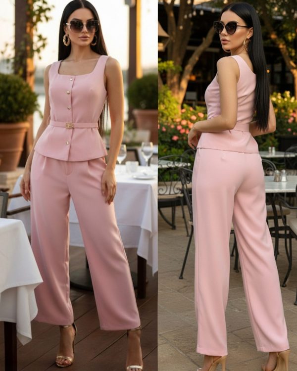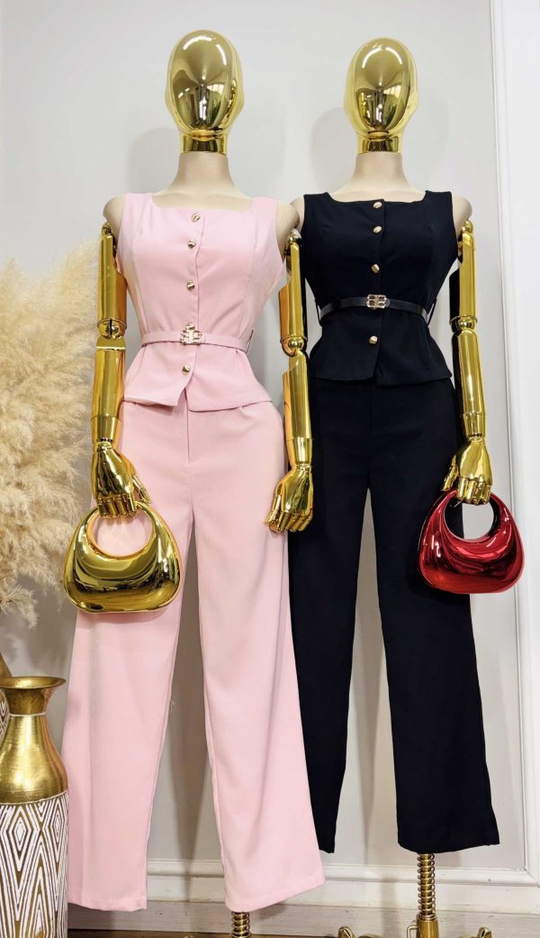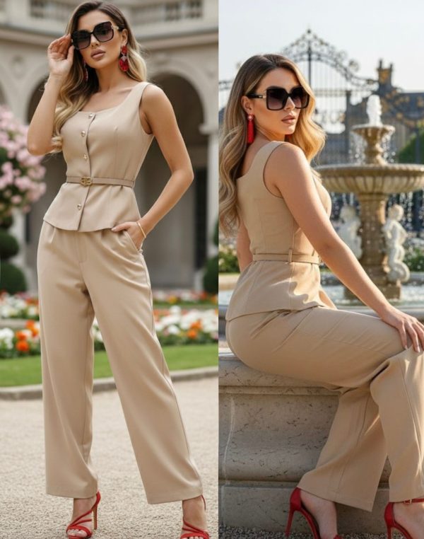 Conjunto elegante y moderno compuesto por chaleco con botones dorados y hermoso cinturón que define y estiliza la figura.