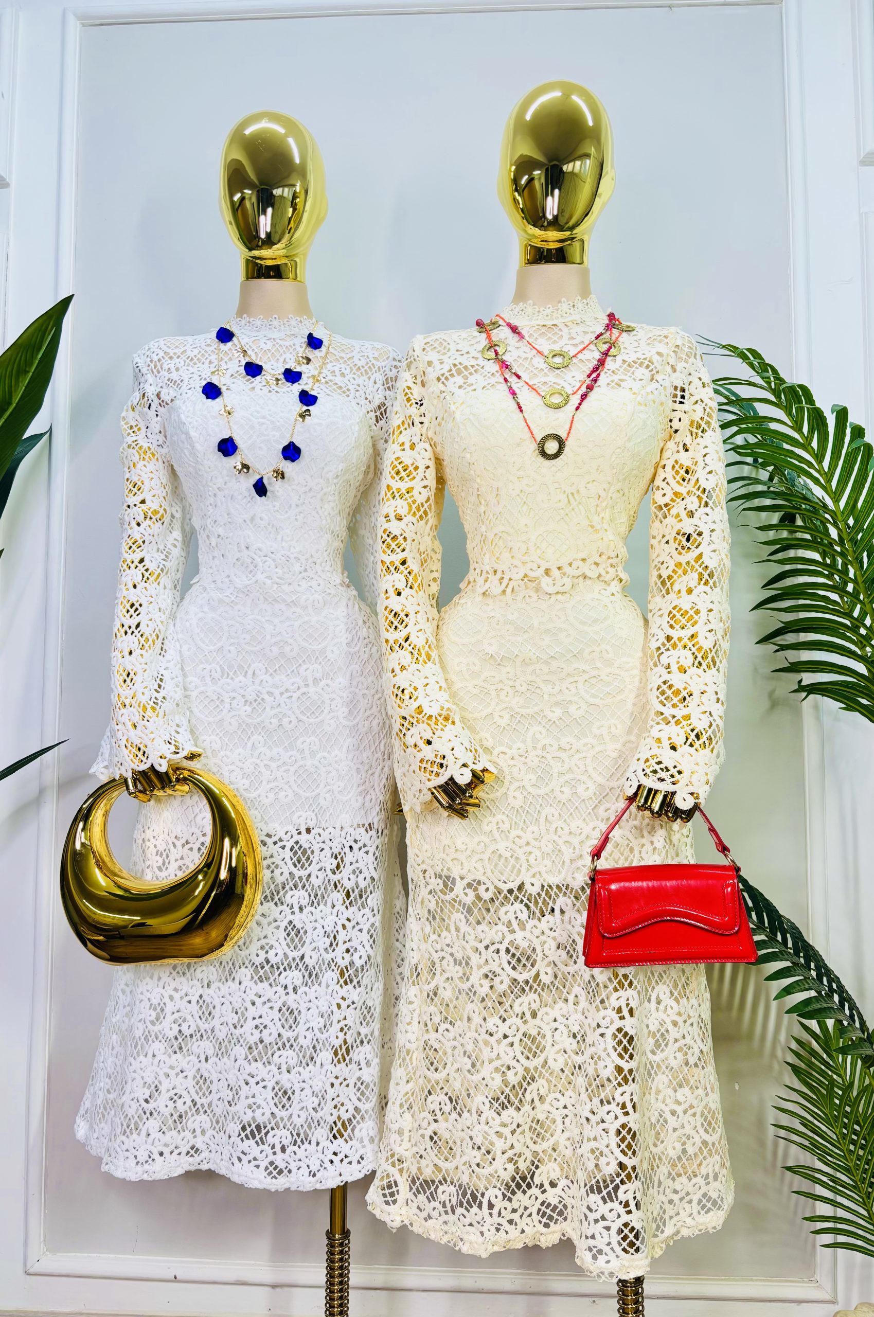Conjunto elegante de dos piezas confeccionado en encaje bordado. Crop top de manga larga con cuello redondo Incluye copas. Transparencia en mangas y espalda. Cierre en espalda. Falda de corte recto, con forro interno hasta muslo y acabado con transparencia en la parte inferior. Cierre trasero. Ideal para lucir elegante y moderna en eventos especiales.
