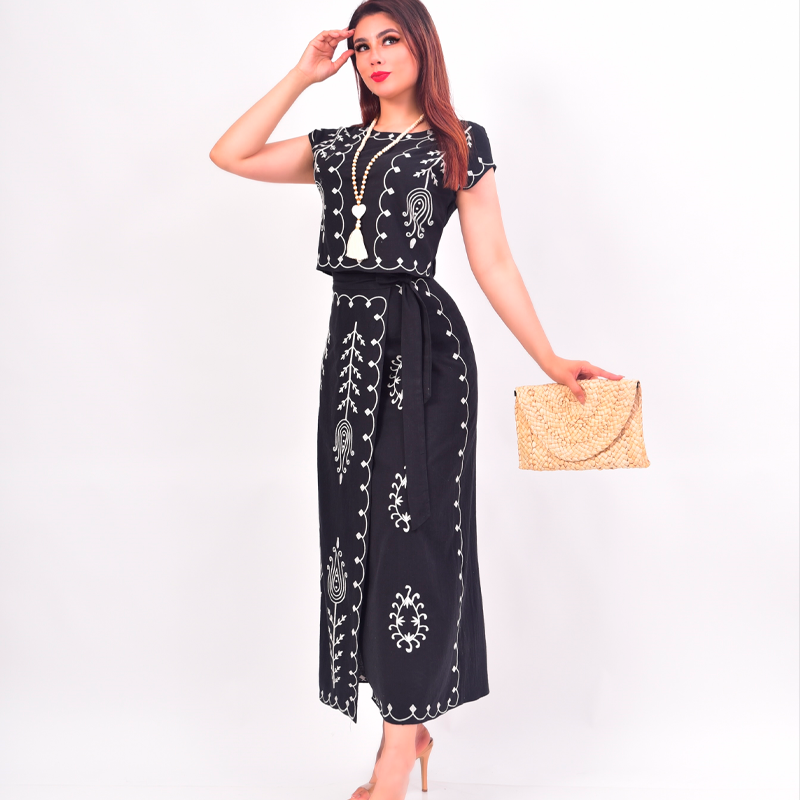 Conjunto fresco de dos piezas, confeccionado 100% en algodón. Bordados estilo artesanal. Blusa manga corta cuello redondo. Falda larga envolvente con ajuste en cintura, cierre invisible lateral. Tela rígida.