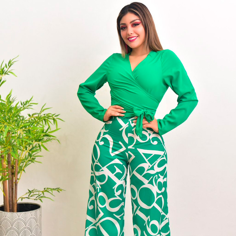 Increíble top con nudo al frente. Manga larga. Pantalón tiro alto con estampado de letras.