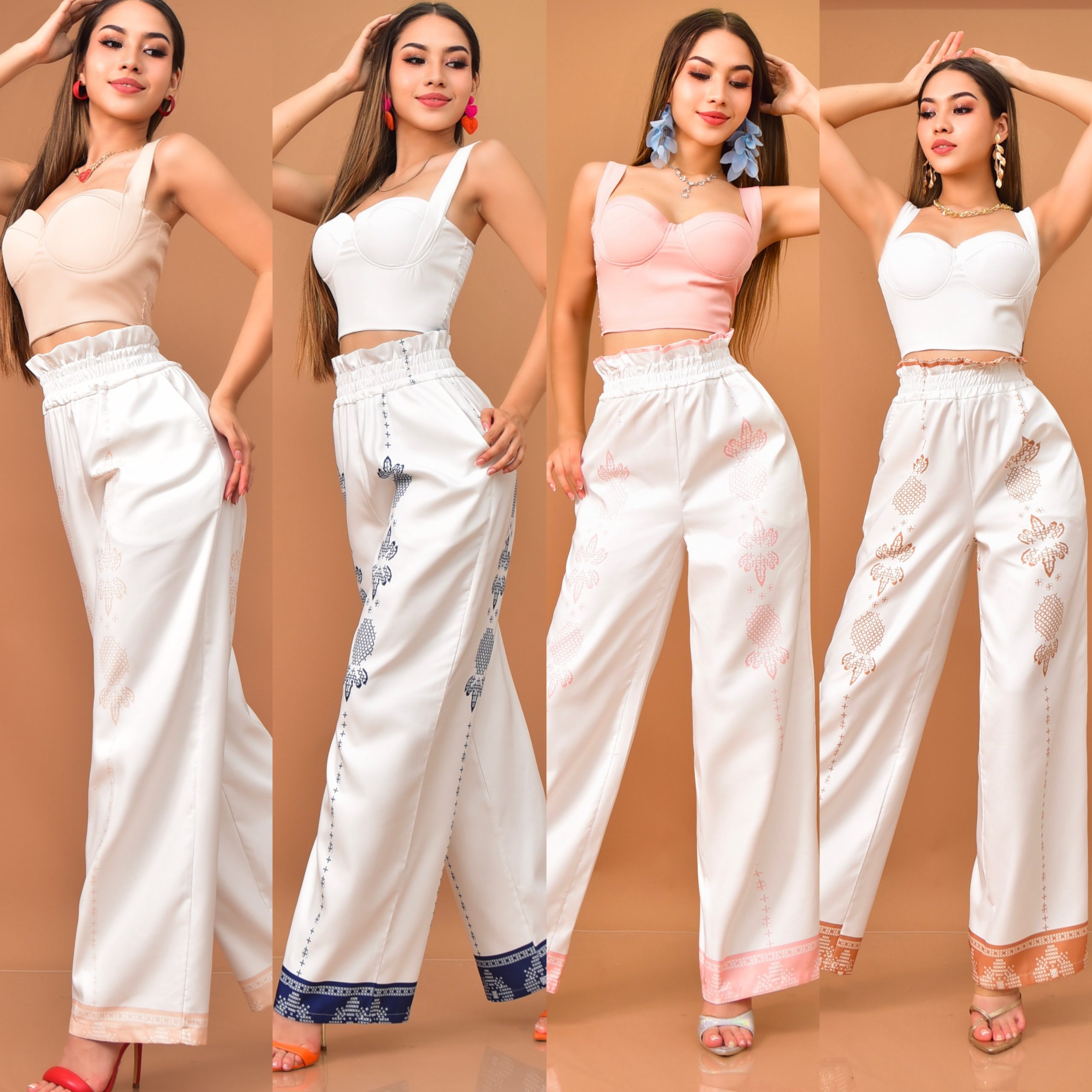 Pantalón estampado amplio estilo palazzo. Ligero y fresco, con pretina elástica y bolsillos a los costados.