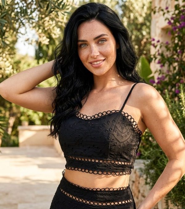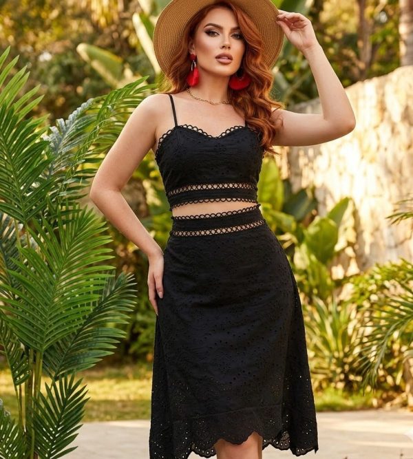 Conjunto tira bordada. Top de tirantes con elástico fruncido en espalda. Falda midi con cierre invisible. Detalle bordado de anillos en contornos del conjunto.