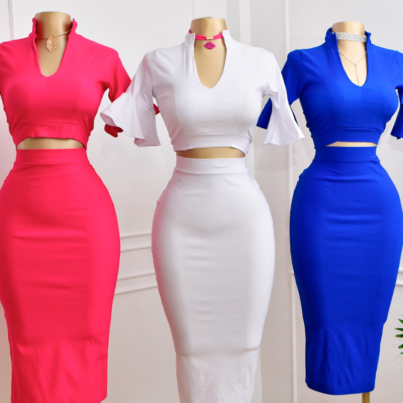 Conjunto dos piezas. Blusa escote profundo en U, mangas cortas tipo campana. Falda midi corte ajustado.