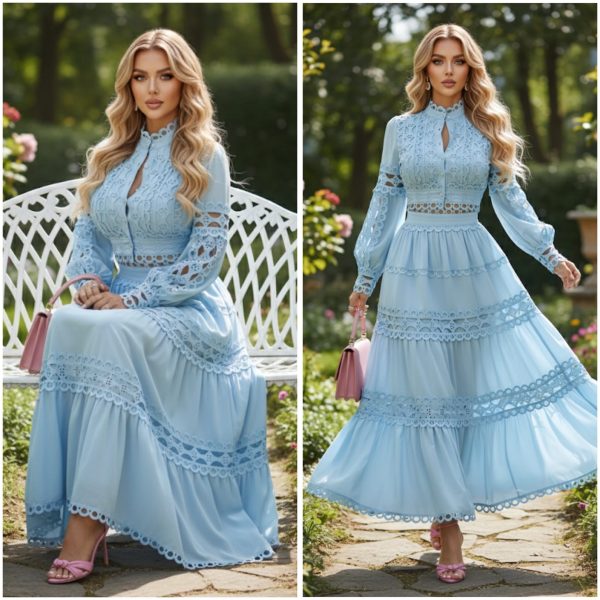 Conjunto de dos piezas con diseños de tejido de encaje con cortes calados. Blusa de manga larga, cuello alto, botonadura frontal. Falda larga con pretina elástica y sutil vuelo que añade movimiento y feminidad al look. Perfecto para lucir un estilo clásico con un aire moderno y chic.