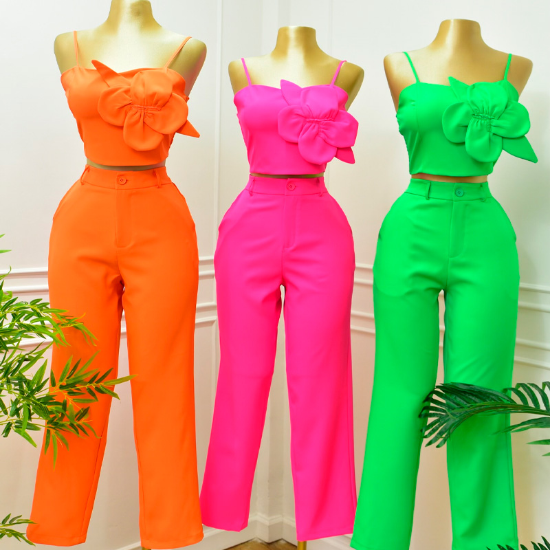 Conjunto dos piezas. Top con flor grande en pecho. Tirantes ajustables, elástico corrugado. Pantalón con elástico en cintura