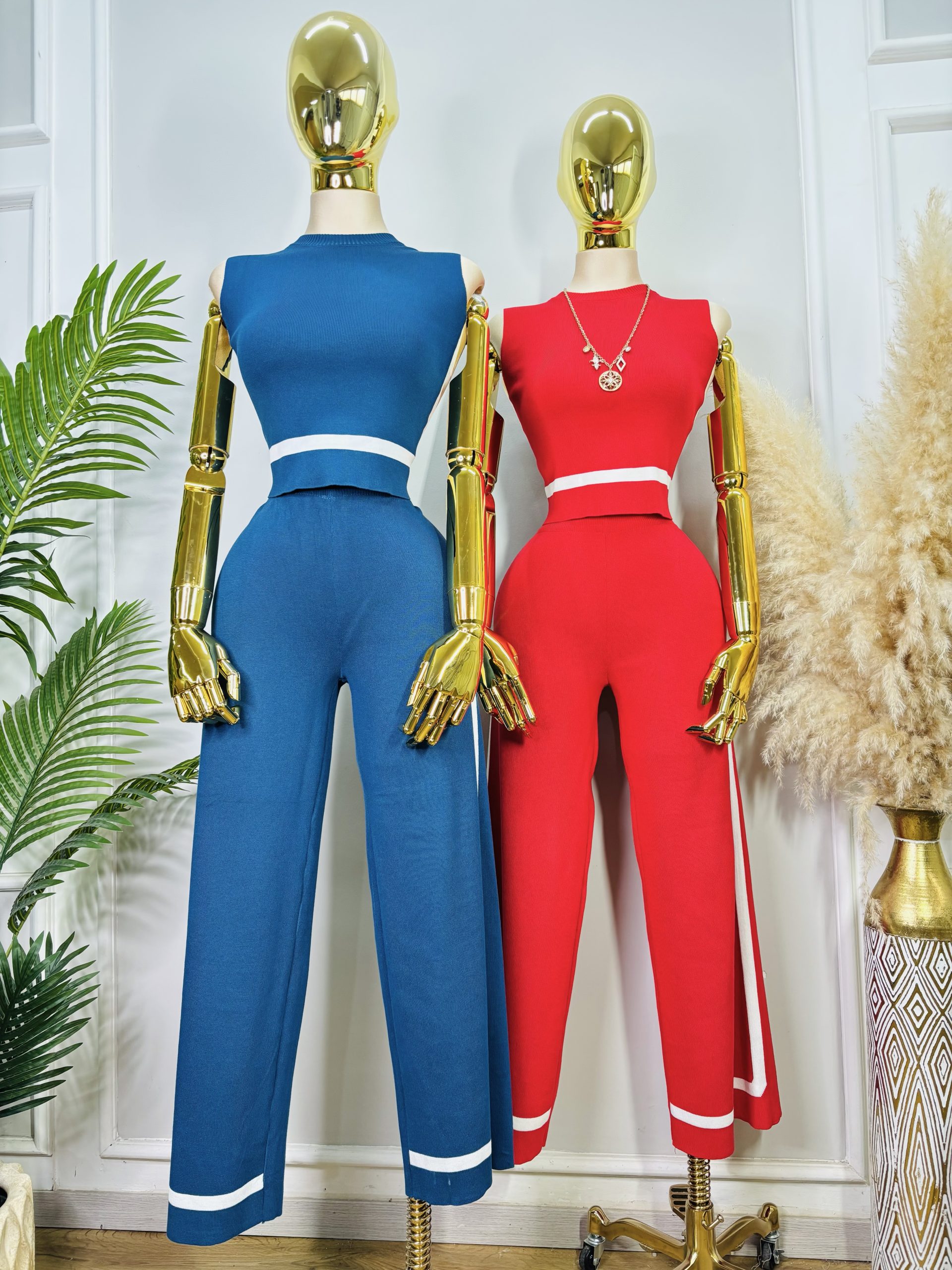 Conjunto tejido de dos piezas en punto suave y elástico. Blusa sin mangas con corte recto y detalle de línea blanca. Pantalón ancho, pretina elástica, tiro alto con franjas decorativas en laterales y bajo que estilizan y alargan visualmente las piernas. Estilo Sporty- Chic, ideal para un look casual con un toque moderno y sofisticado.