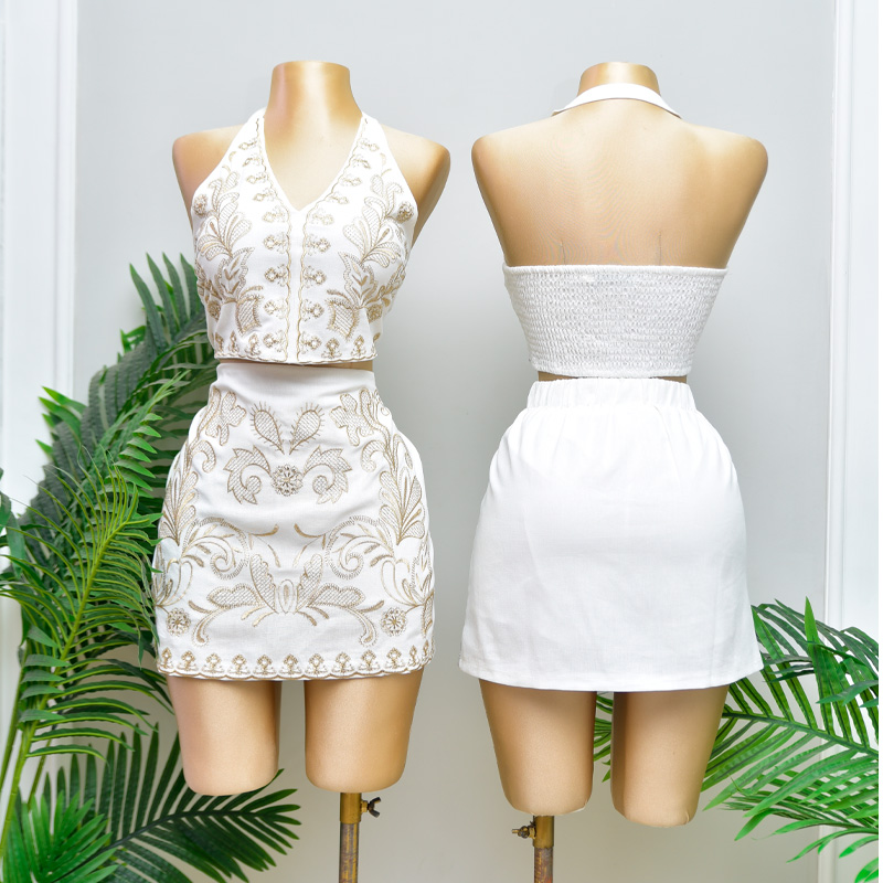 Conjunto bordado dos piezas. Confeccionado en lino y algodón. Detalle de bordados contrastantes. Top halter con elástico fruncido en espalda. Falda con elástico en cintura, forro de short.