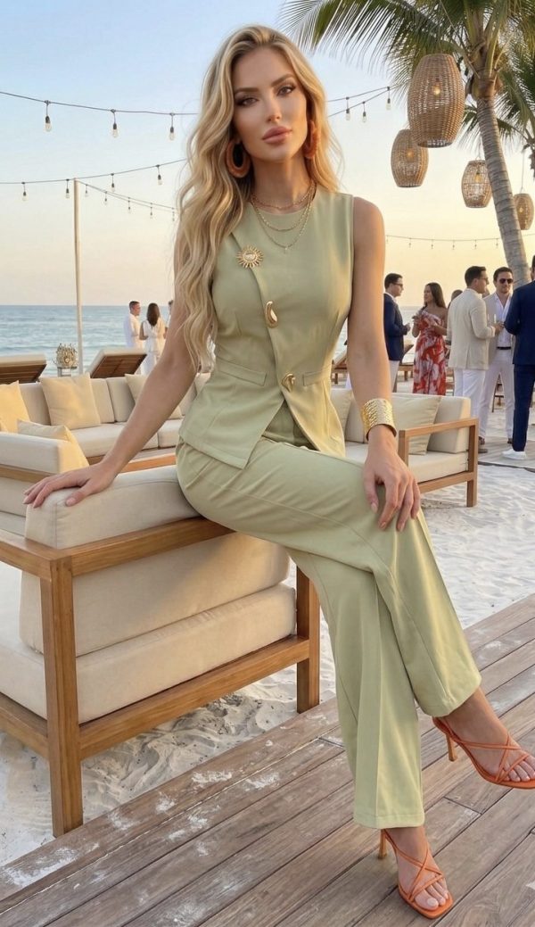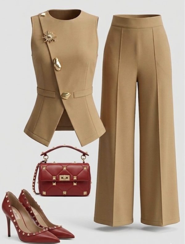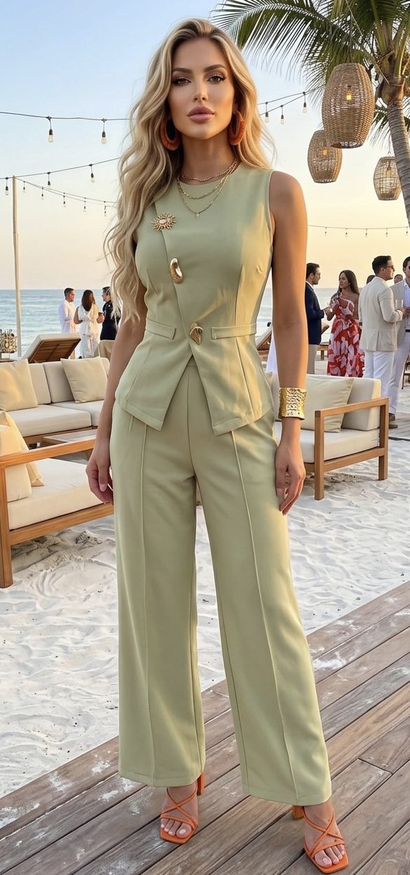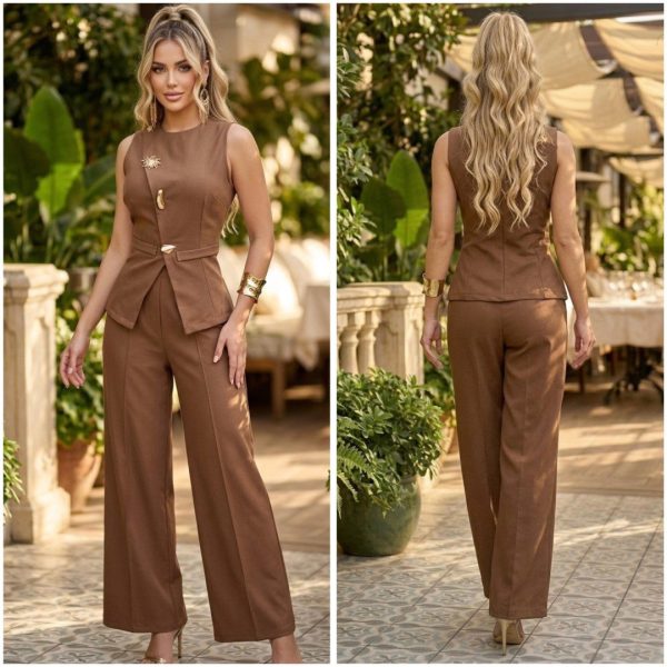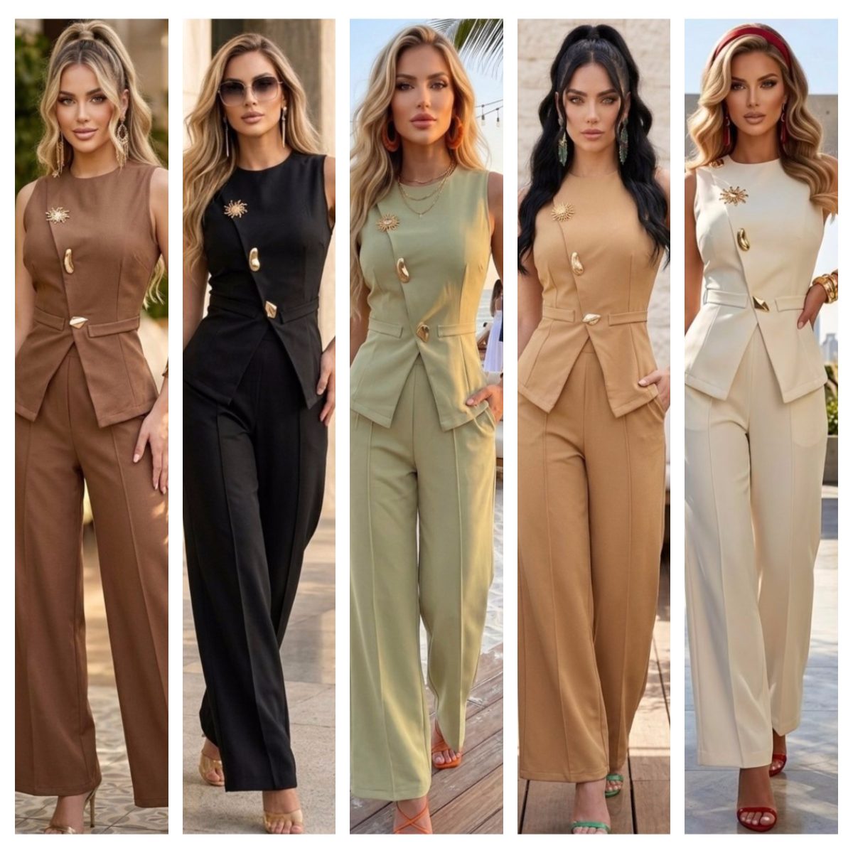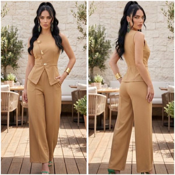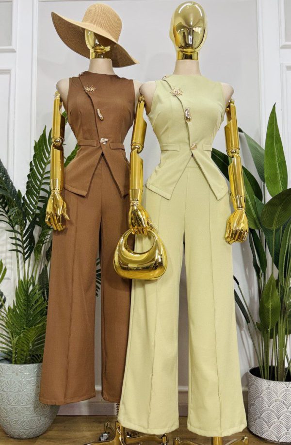 Sofisticado conjunto de dos piezas, confeccionado en tela fresca texturizada. Blusa sin mangas de silueta ajustada con sutil asimetría adornada con botones dorados de estilo arquitectónico y orgánico. Pantalones de pierna recta con cierre invisible a un costado y elástico en la parte trasera. Bolsillos a los costados.