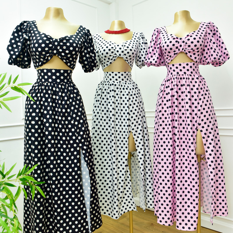 Conjunto estampado lunares. Top mangas tipo globo, tira en escote que da efecto moño, elástico corrugado en espalda. Falda pretina ancha, abertura en muslo, cierre invisible.