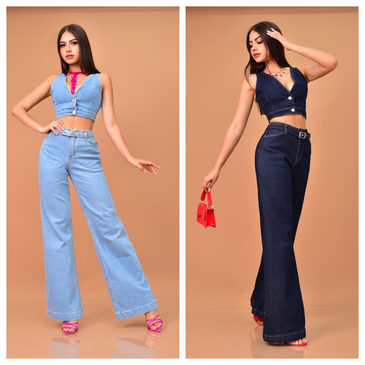 Conjunto de mezclilla estilo denim de top y pantalón.