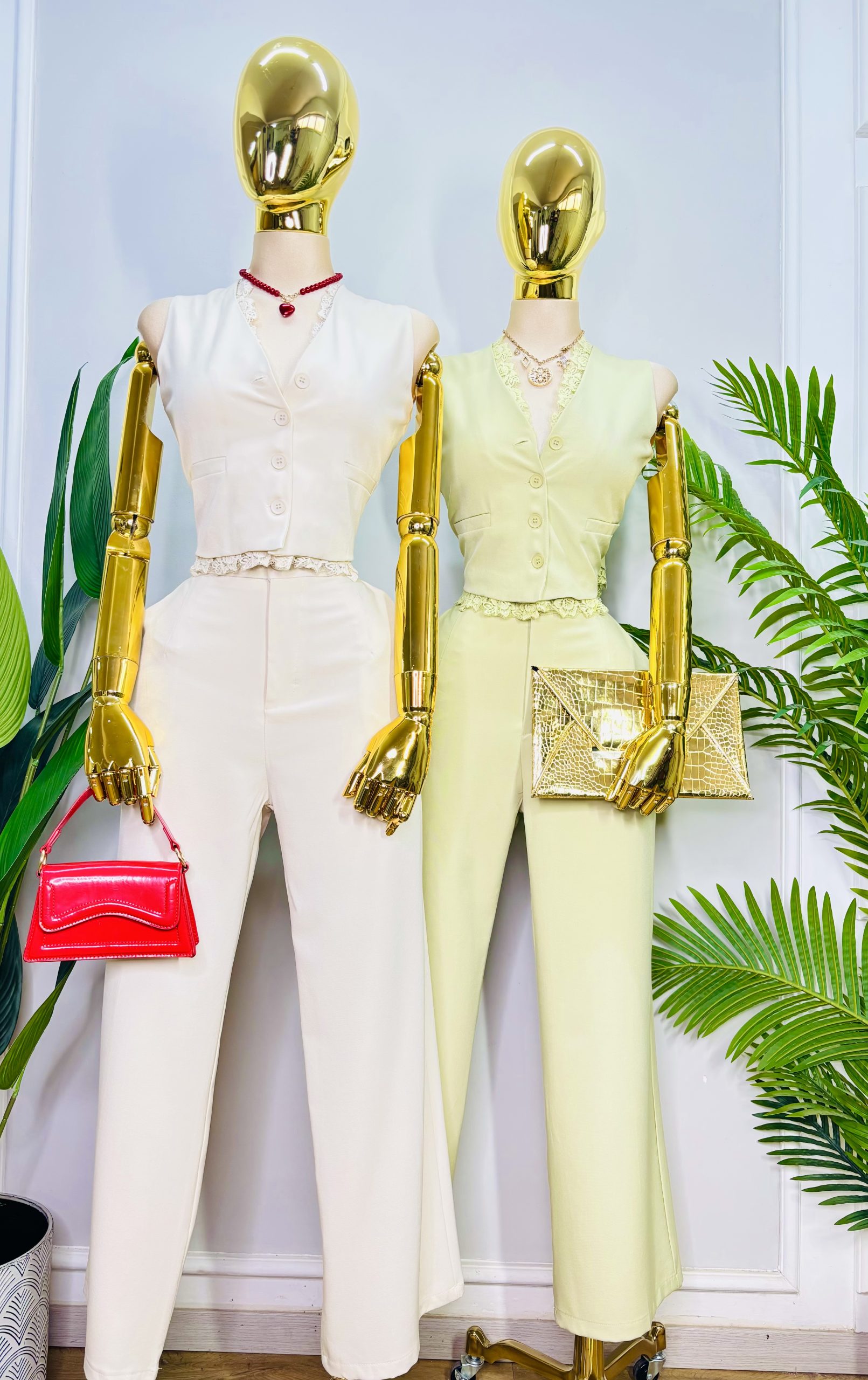 Conjunto femenino compuesto por chaleco corto y pantalón de pierna ancha. El chaleco presenta corte en “V” con botones frontales y delicado encaje en el borde inferior, agregando un toque romántico y sofisticado, con cinta y hebilla en la parte trasera para ajustarlo y simulación de bolsillos. Los pantalones a juego tienen cintura alta con pinzas al frente, lo que estiliza la silueta y bolsillos a los costados.