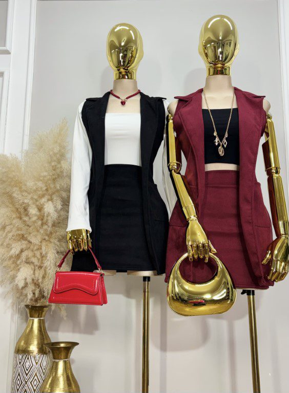 Conjunto de gamuza de blazer largo sin mangas y falda corta. Blazer con pinzas en la parte trasera que ayudan a estilizar la figura y definir la silueta, con bolsas a los costados.