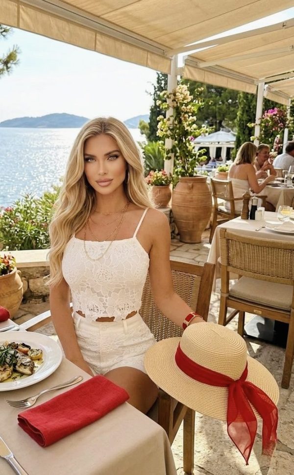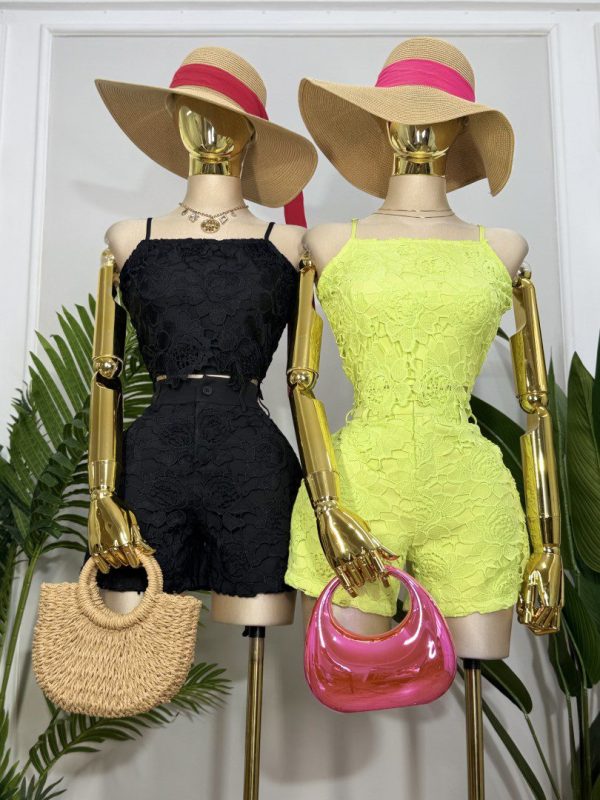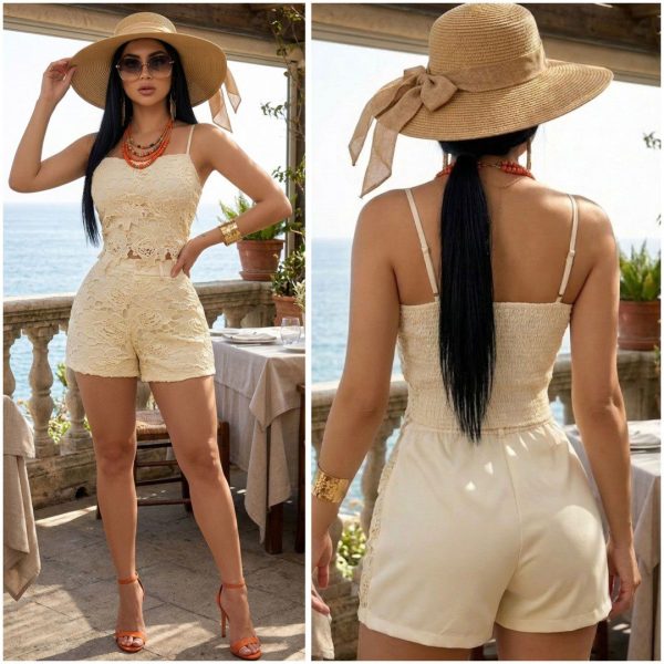 Conjunto confeccionado en tela fresca, con guipur floral. 🌸
