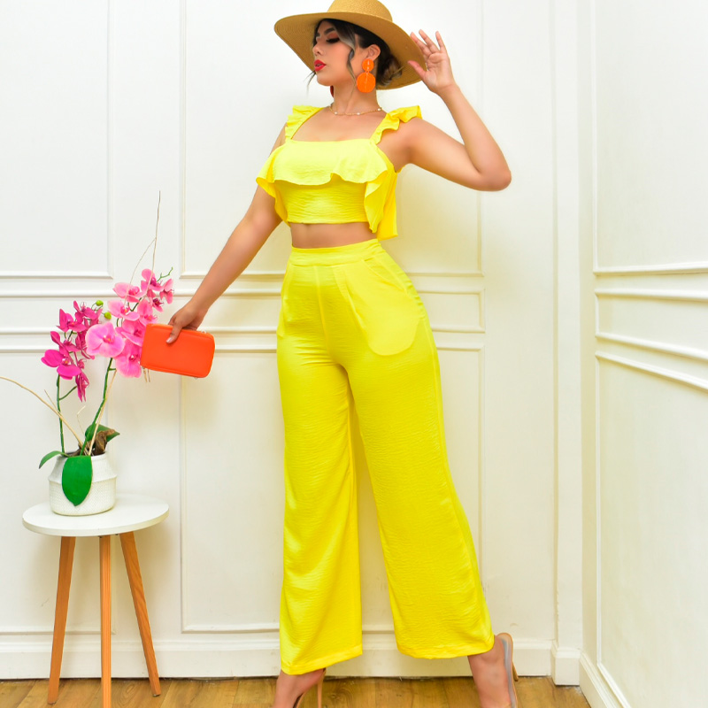 Conjunto de dos piezas. Top con volante y cremallera en espalda, tirantes con volante y elástico. Pantalón corte amplio, cierre invisible en el costado.