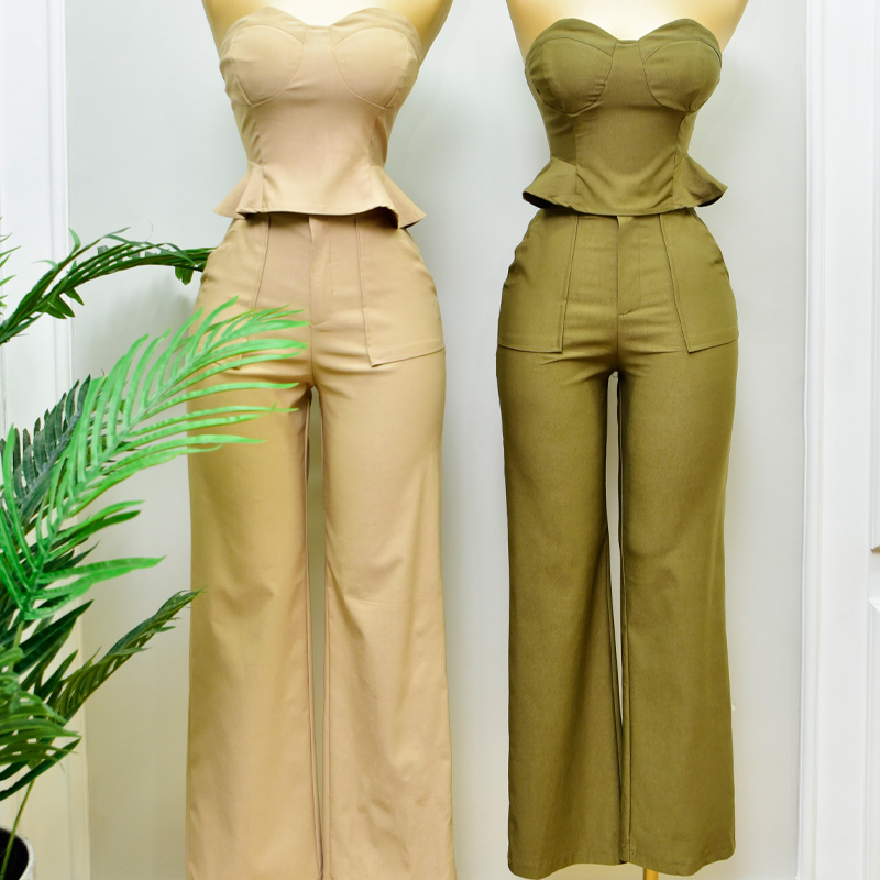 Versátil conjunto de pantalón y top. Top con elástico fruncido en espalda y sexy escote. Pantalón corte recto con bolsillos. Súper stretch.