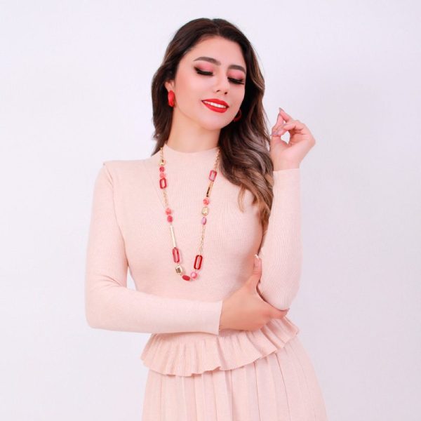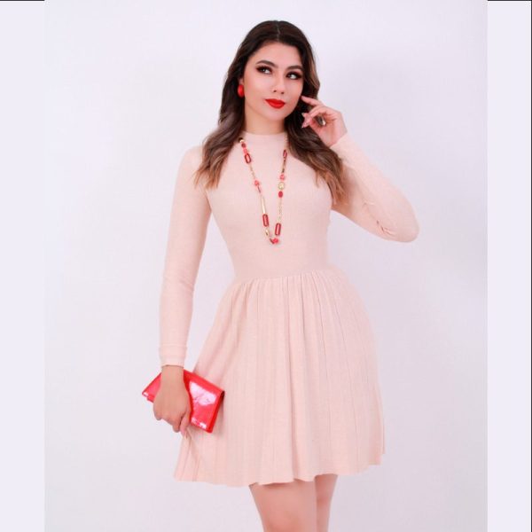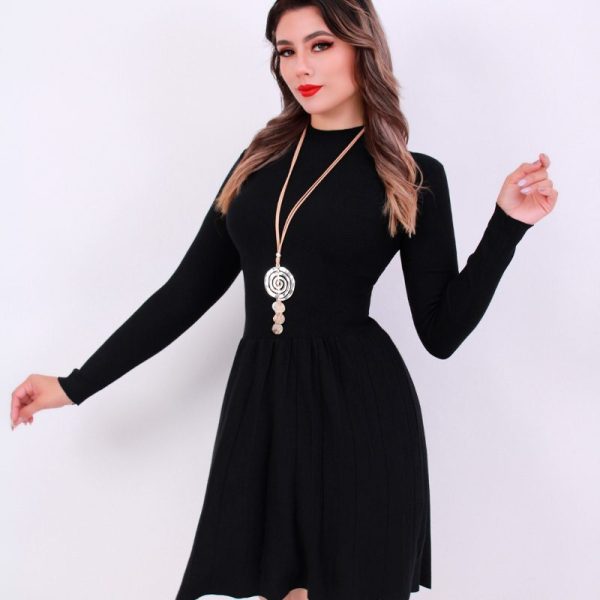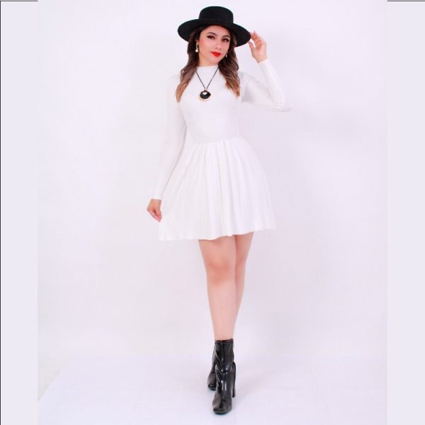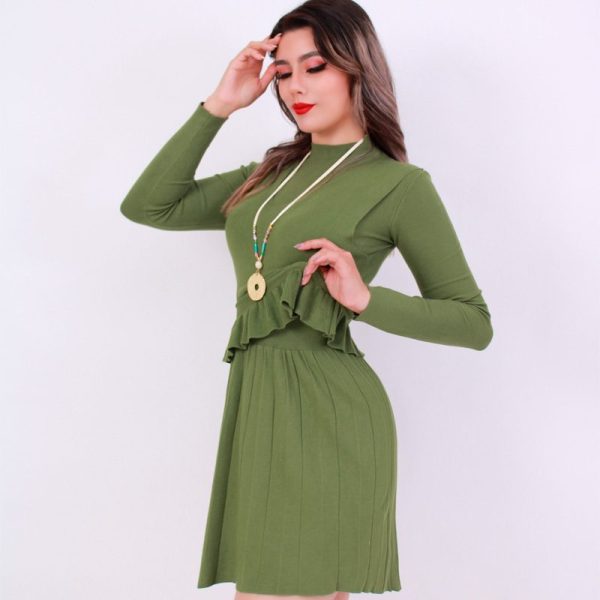 Conjunto de punto dos piezas. Vestido corte línea A, tabloneado, cuello alto y manga larga. Chaleco en mismo todo cuello V, con volante ondulado en cintura. Stretch