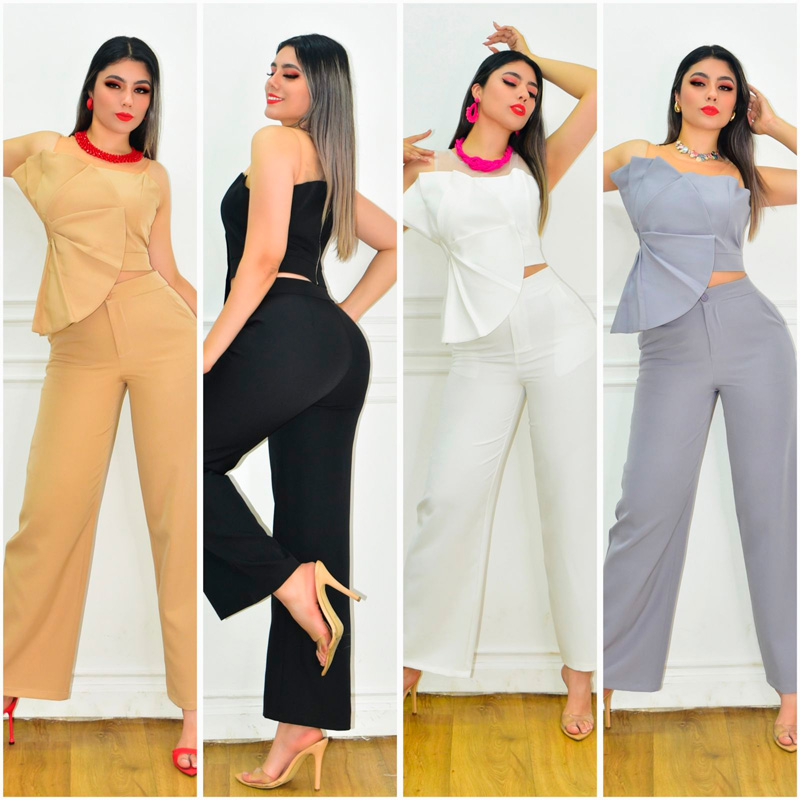 Conjunto de dos piezas, Pantalón corte recto, con bolsillos. Blusa con detalle frontal de volante semicírculo con pliegues. Hombros de mesh y botón en nuca. Cierre metálico en espalda, top con forro. Tela rígida.