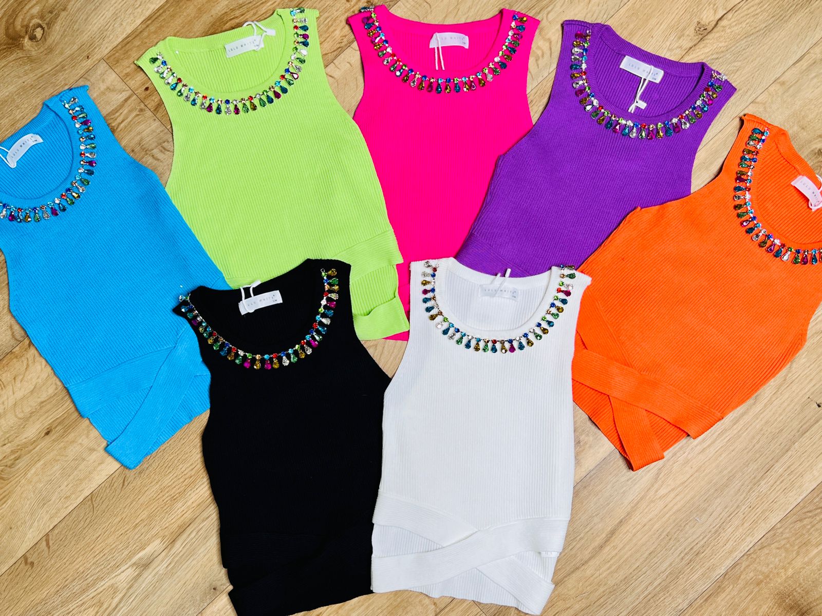 Crop top con pedreria de colores en el cuello y cruzado en cintura. Abarca de 7 a 9