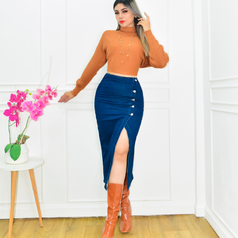 Falda midi de mezclilla, con diseño de tiro alto y botones en la parte frontal. Su ajuste ceñido resalta la figura, mientras la abertura lateral añade un toque moderno y atrevido. Perfecta para combinar con tops ajustados o suéteres cortos para un look sofisticado y casual.