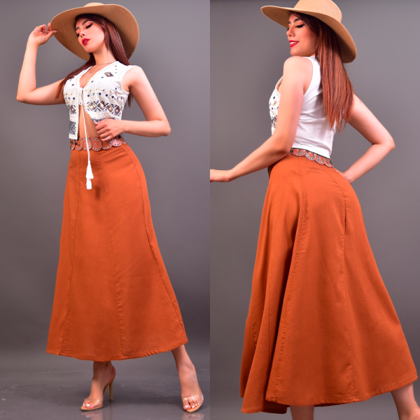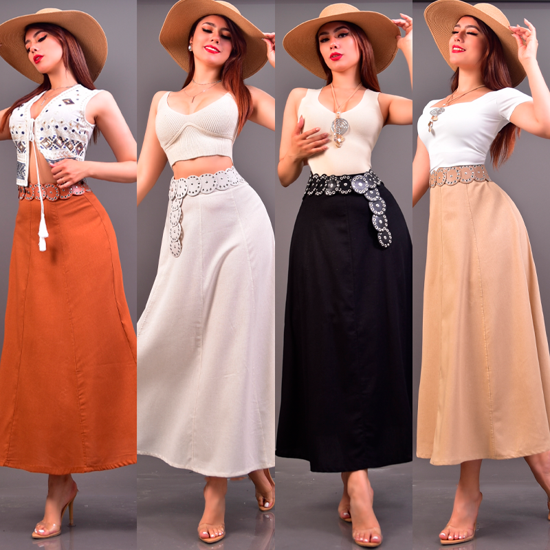 Falda de vestir corte envasé o acampanado. Confeccionada en viscosa. Corte a la cintura. Cierre invisible. Incluye cinturón de círculos y detalles metálicos.