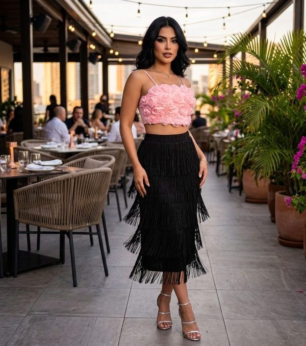 Falda semi satinada con flequillos en capas. Super elástico en cintura.