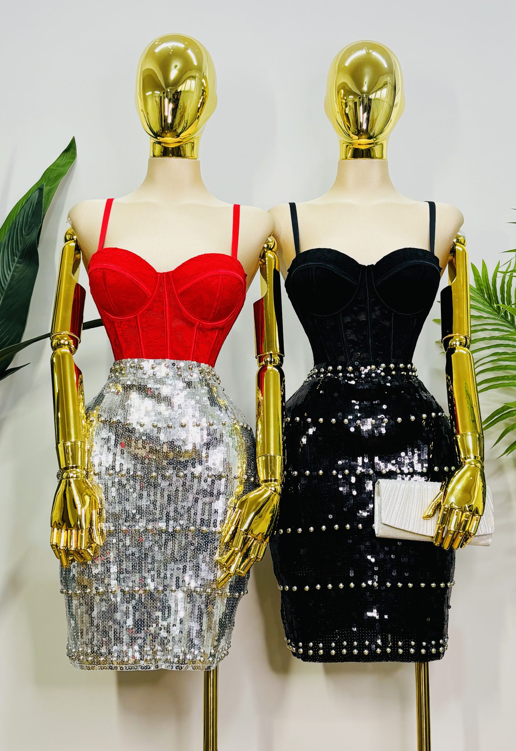 Falda metálica de lentejuelas con acabado brillante tipo espejo. ✨ Cierre invisible lateral y detalles de aplicaciones tipo estoperoles que aportan textura y un toque Glam.Corte ajustado que resalta la figura y la convierte en una prenda ideal para looks de noche llenos de estilo y sofisticación. ❤‍🔥